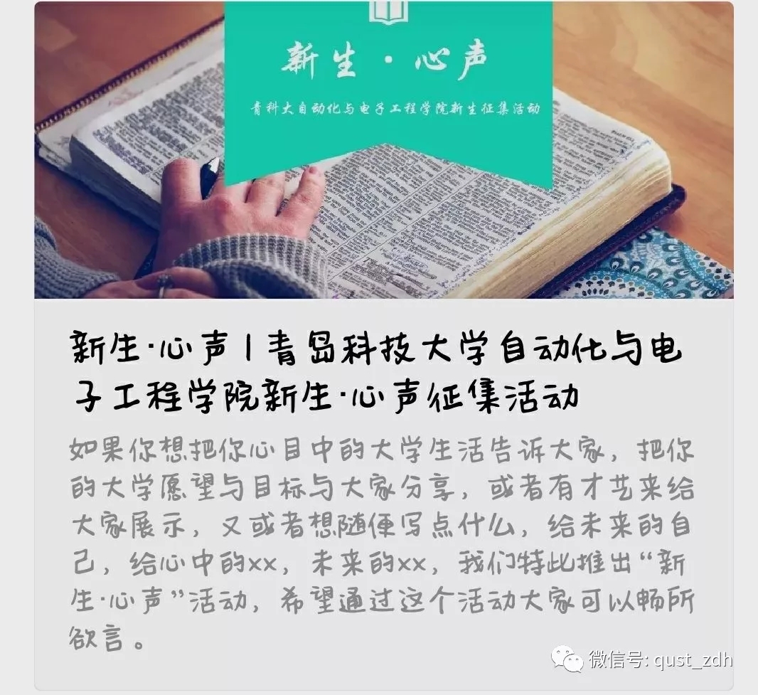 在2018级新生收到录取通知书后,学院第一时间通过官方微信公众号“微自化”发起“新生·心声”征集活动,通过学生自主投稿、学院审核,在微信公众号推送原创文章,以此表达新生对大学生活的向往和期待,同时为新生提供展示自我的平台,增强了新生对学院的认同感和归属感。同时,在公众号推送迎新专题,帮助新生尽早了解、适应大学生活。
