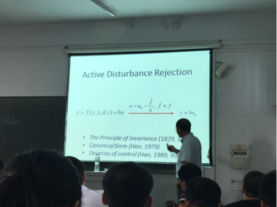 讲座过程中,高志强教授介绍了自抗扰控制技术的基本思想,并将其与现如今工程应用最多的PID控制做了对比,着重介绍了自抗扰控制的实用性优点以及其如何突破了传统PID的限制。对自抗扰控制技术的核心即扩张状态观测器进行了详细讲解。讲座结束之后,高志强教授与在场师生进行了热烈积极的讨论,就研究过程中存在的疑惑与问题进行了深入的交流与探讨。