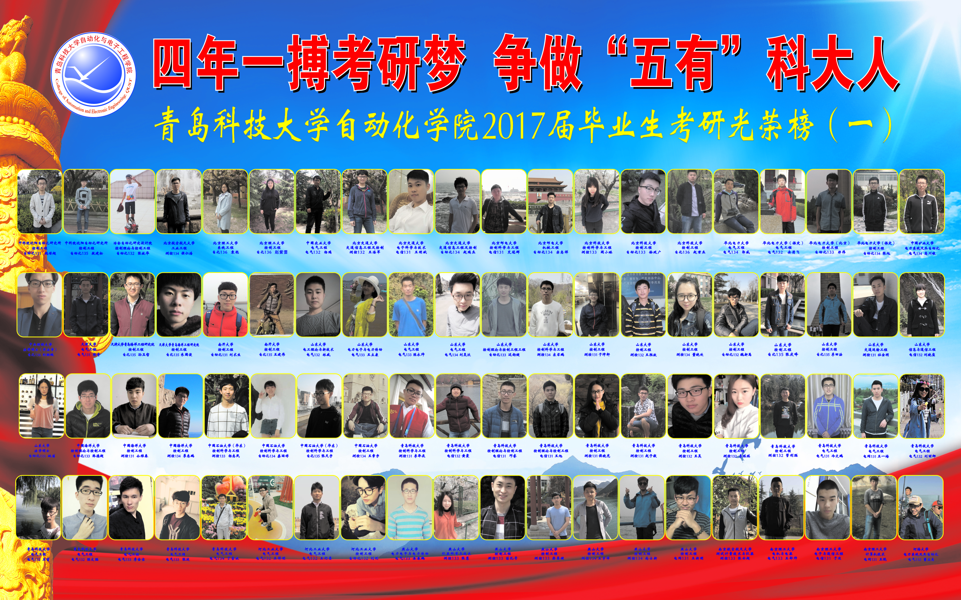 2017届毕业生“四年一搏考研梦,争做‘五有’科大人”考研光荣榜展出,今年学院共有本科毕业生516人,其中330人报考研究生,159被伯明翰大学、曼彻斯特大学、中科院、北京航空航天大学、北京理工大学、山东大学、华北电力大学等57所国内外知名大学录取,升学录取率达30.8%,比往年同期提高近50%,创历史新高。