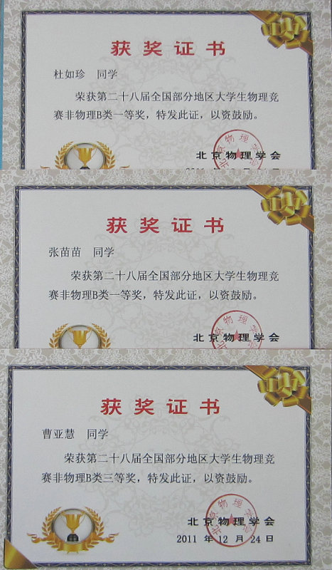 日前,第28届全国部分地区大学生物理竞赛成绩揭晓。在非物理B组竞赛中,我院自化101班张苗苗同学、测控102班杜如珍同学获得一等奖,电信102班曹亚慧同学获得三等奖。
