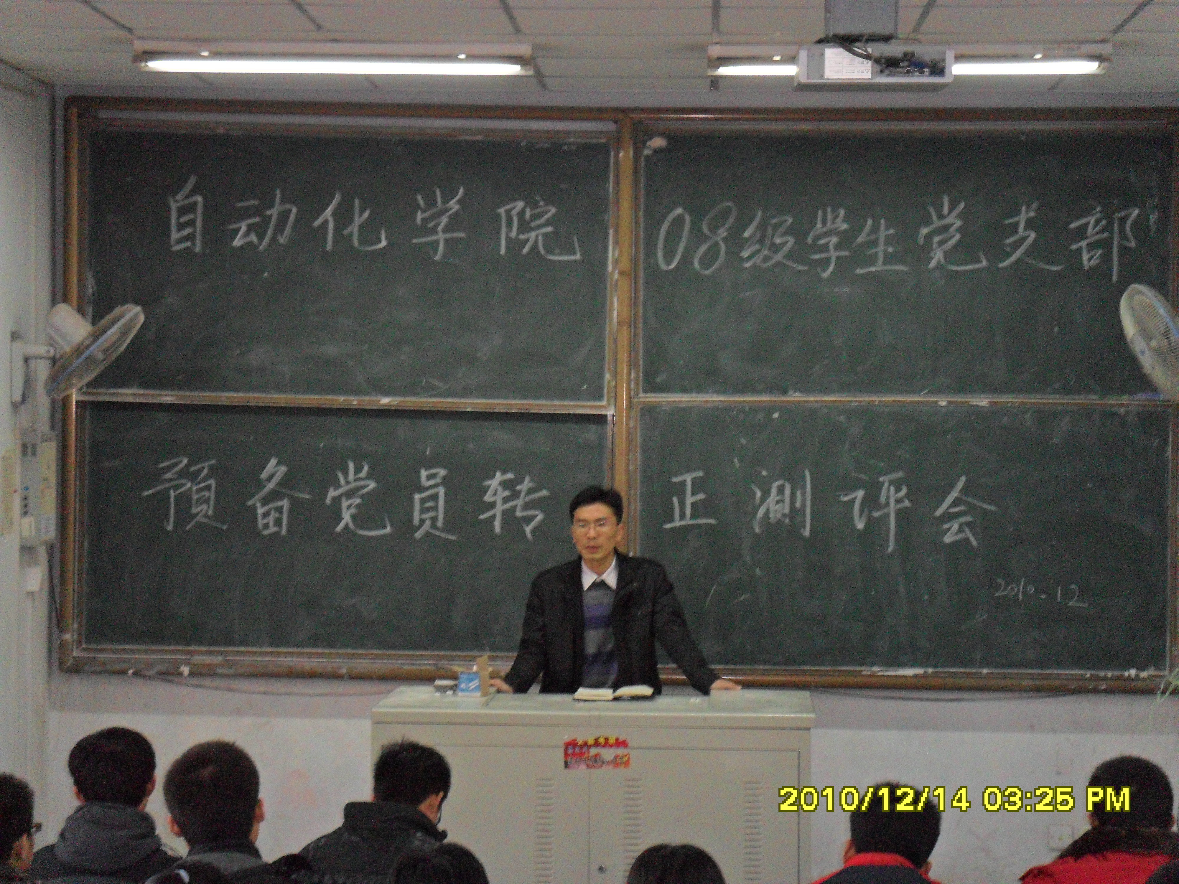 2008级学生党支部在一教102召开预备党员转正测评会。学院党总支副书记兼副院长肖强、分团委副书记刘名森、2008级辅导员、08支部全体学生党员出席,预备党员所在班级的学生代表参加,会议由党支部书记刘名森主持。