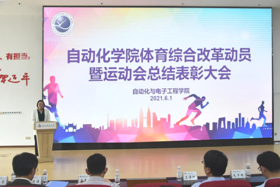 学院团委副书记于彬汇报学院推进各项体育活动、赛事工作中的做法以及后续工作中的努力方向。学生代表马孟岐发言,表示全体学生将牢记这份荣誉,再续青年学生责任与担当,为学院发展贡献青春力量。