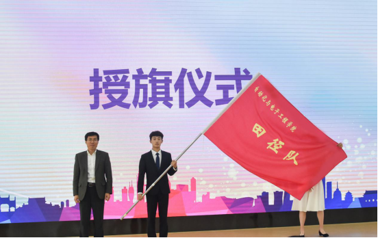 吕德谦为学院田径队授旗,并宣读学院大学生体育综合改革实施方案。