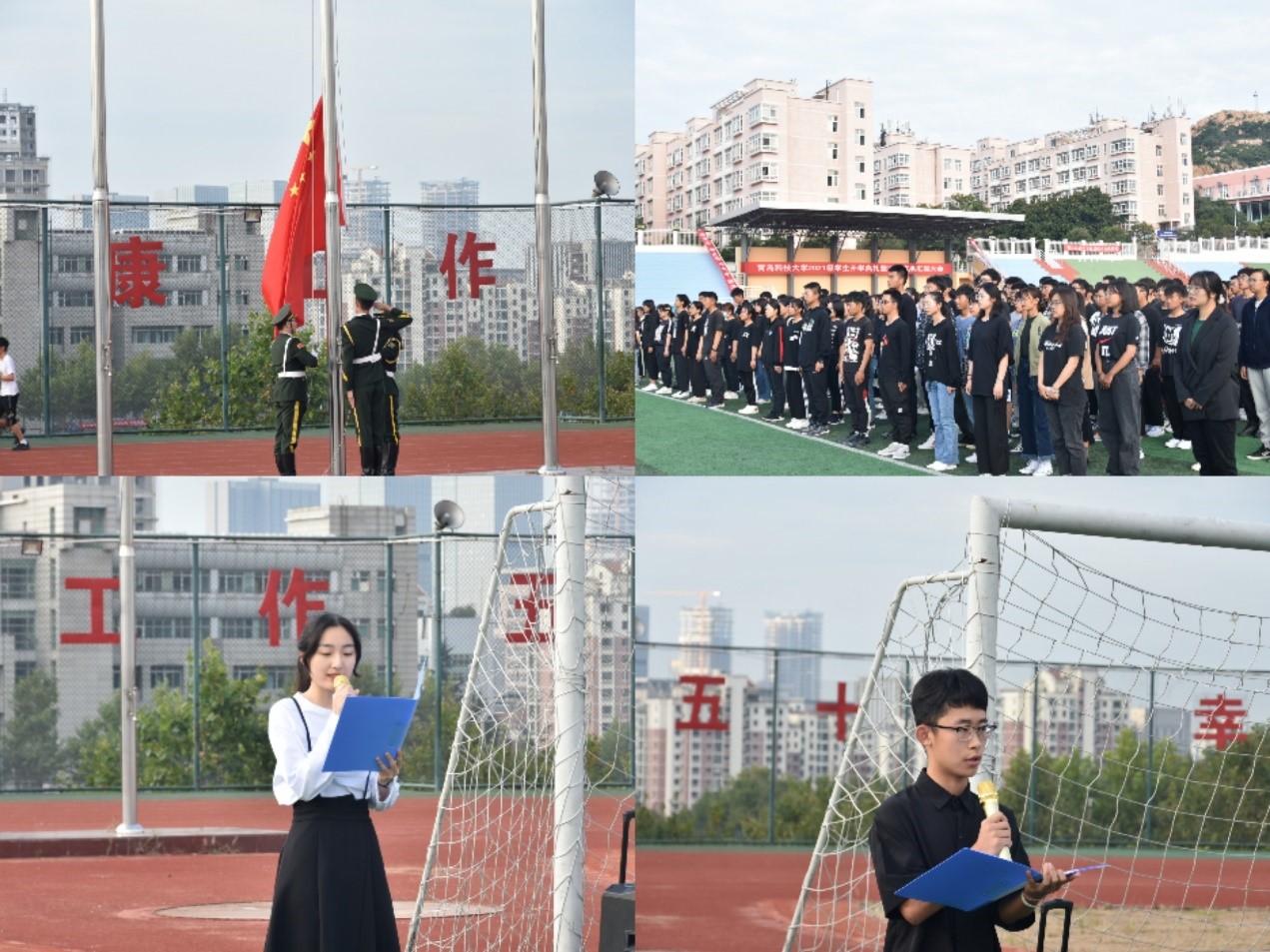 全体21级新生参加升旗仪式。鲜血染红的五星红旗伴随着雄壮的国歌声冉冉升起,迎风飘扬,随后全体与会成员默哀一分钟,整个操场庄严肃穆。20级学生代表阚新磊做国旗下演讲,用九一八事变、中印冲突的案例向21级新生传达了“国防重任,在于你我”的思想。呼吁同学们勤奋学习、严于律己,牢记时代使命。
