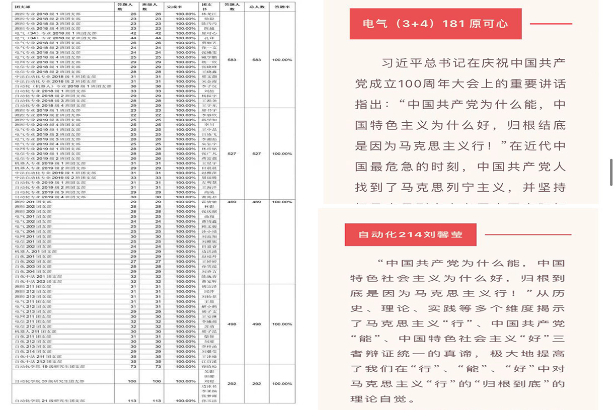 依托“青年大学习”平台作为学生每周思政课的载体,形成各团支部每周学习情况通报和心得体会分享制度,让学生在学中做、在做中学。将党史学习教育深入到青年生活始终,引领学院青年知史爱党、知史爱国,激发学生爱党爱国情怀。