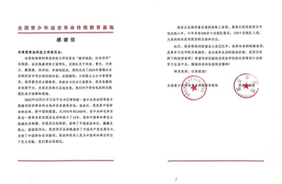 近日,全国青少年延安革命传统教育基地、延安市团校向我院“数字赋能,红色传承”实践队发来感谢信,对我院给予2023年全国大学生延安暑期社会实践专项活动的大力支持以及实践队青年师生助力圣地发展表示衷心的感谢,同时对我院暑期社会实践队在实践过程中的表现予以充分肯定。