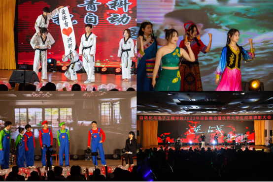 民族舞《多彩民族韵》用上下五千年的国风故事与翩翩舞姿的巧妙结合,弘扬民族精神同时,展现出中华民族隽永平和的博大民族气韵。强体魄才能兴中华,兴体育方能振中国,大学生体育联盟代表进行的体育成果展示是“自”家人始终坚持“爱体育,兴科大”的最好体现;小品《谁杀死了周末》则在幽默中提醒同学珍惜时间,不负青春大好时光;少年的热血记忆永不褪去,激昂的音乐传达你我思绪,乐队表演的《逆战》《海阔天空》带领同学们一同感受打击乐的魅力,为同学们找到前进的方向,点亮心中的梦想。第二篇章在音阶悦动、乐符环绕的欢乐氛围中结束。