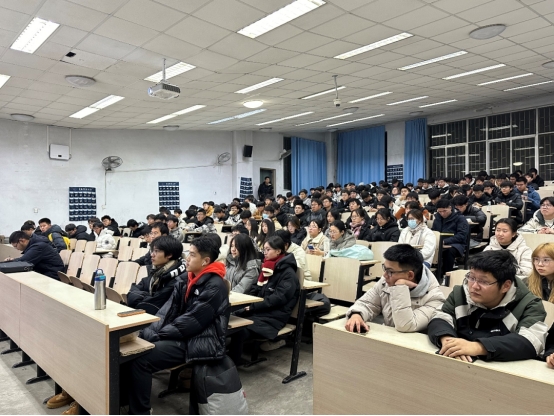 在弘毅楼举办期末考试考风考纪教育大会暨离校安全教育大会。学院团委书记兼学工办主任、2023级新生辅导员郭蒙蒙主持,新生辅导员刘志飞及全体大一学生参加会议。