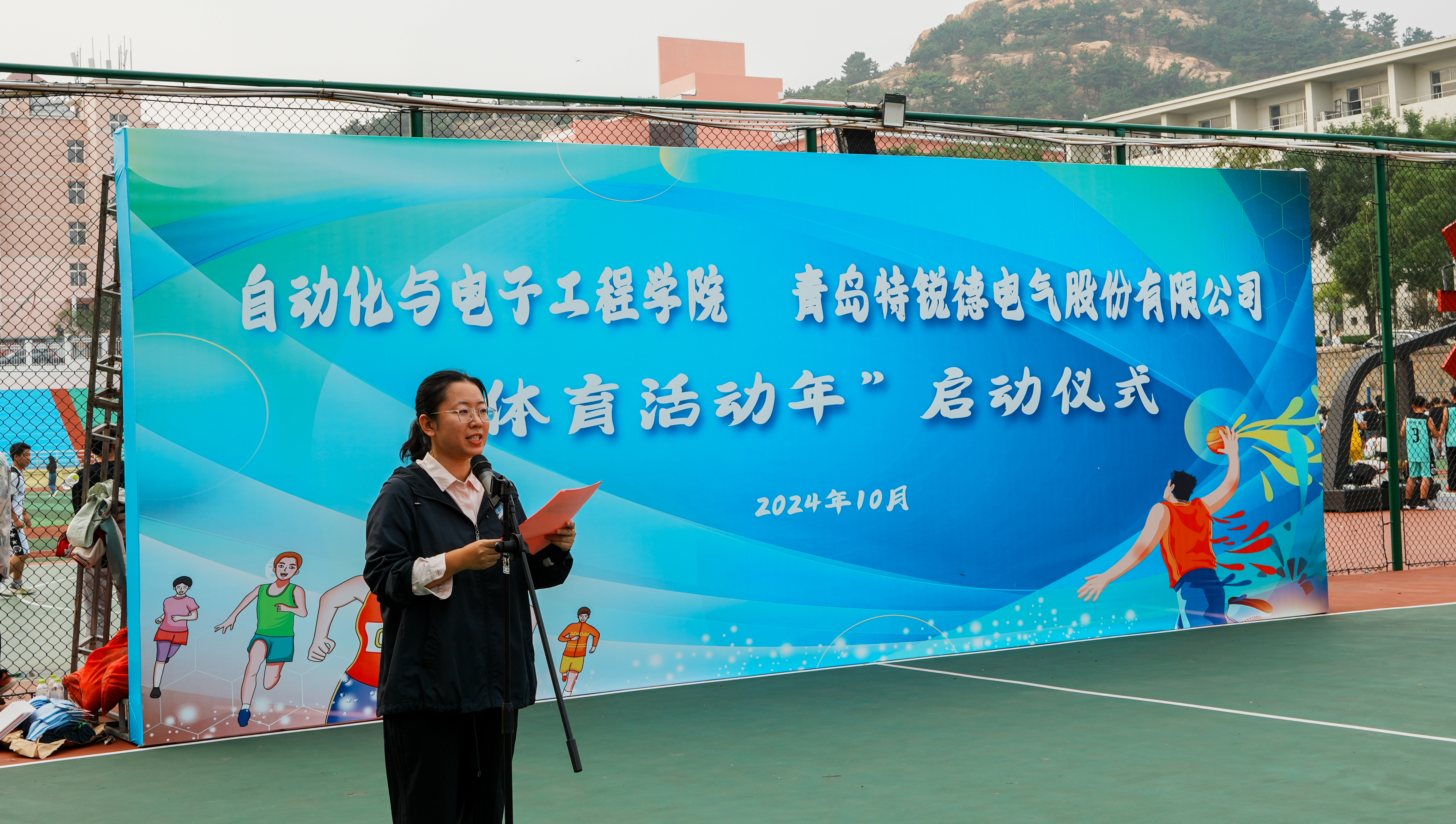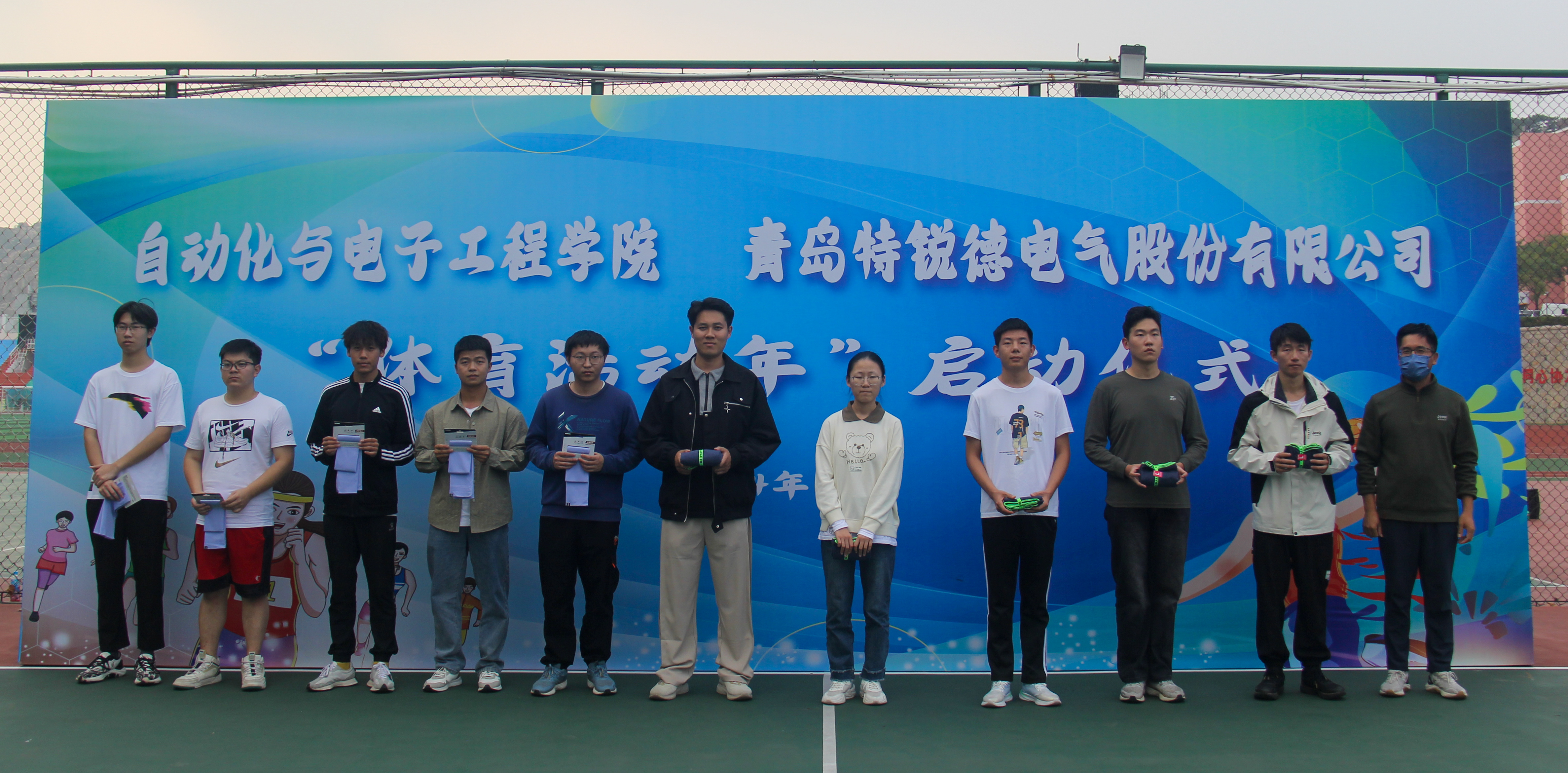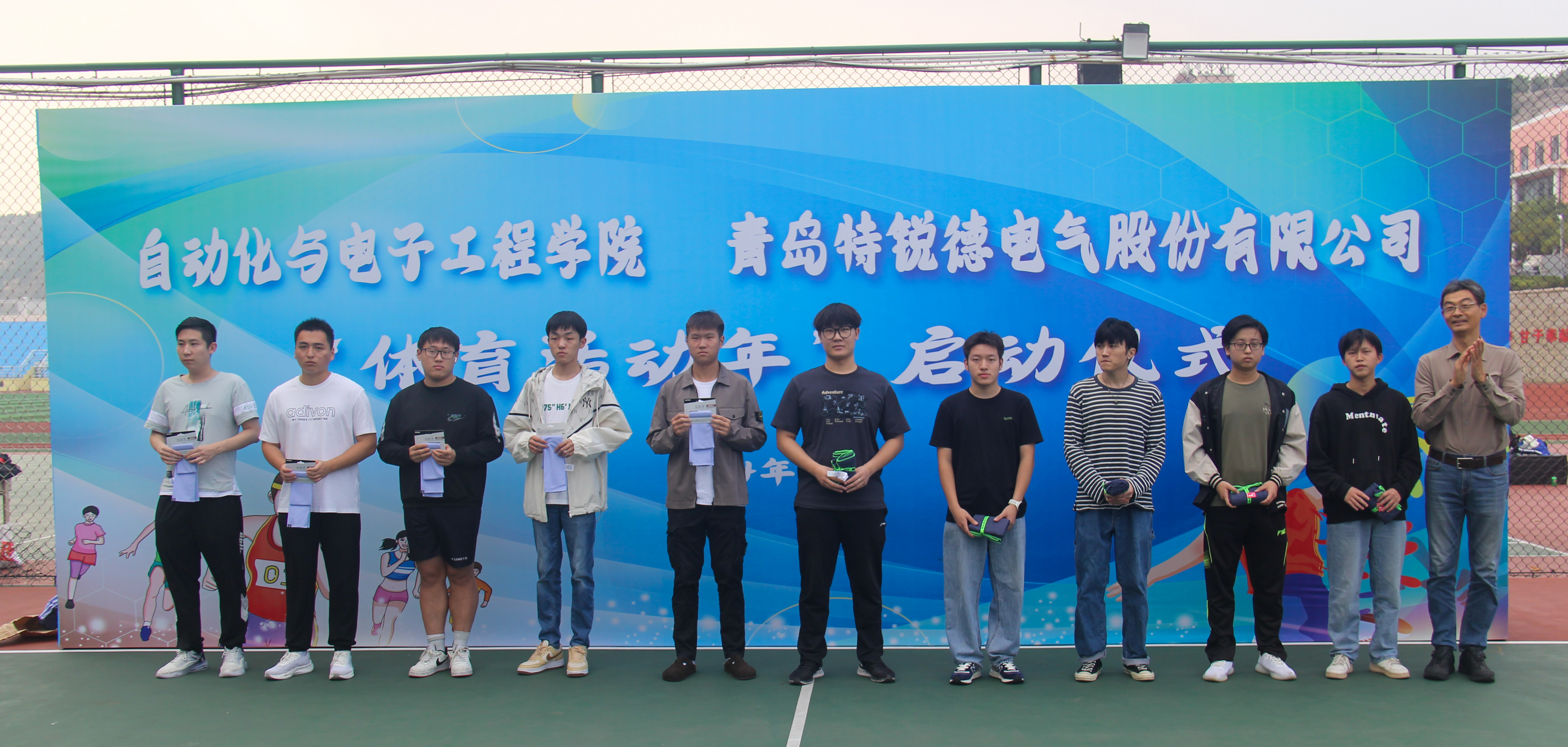 与青岛特锐德电气股份有限公司联合举办的“大学生体育活动年”启动仪式于南苑篮球场举行。青岛特锐德电气股份有限公司人力资源中心人力总经理助理张莹,学院党委书记李卉,学校教务处专职教学督导员楚晓东、学生处副处长李春家、团委副书记李浩,学院党委副书记兼副院长刘名森出席启动仪式。仪式由学院团委书记兼学工办主任雷静主持。