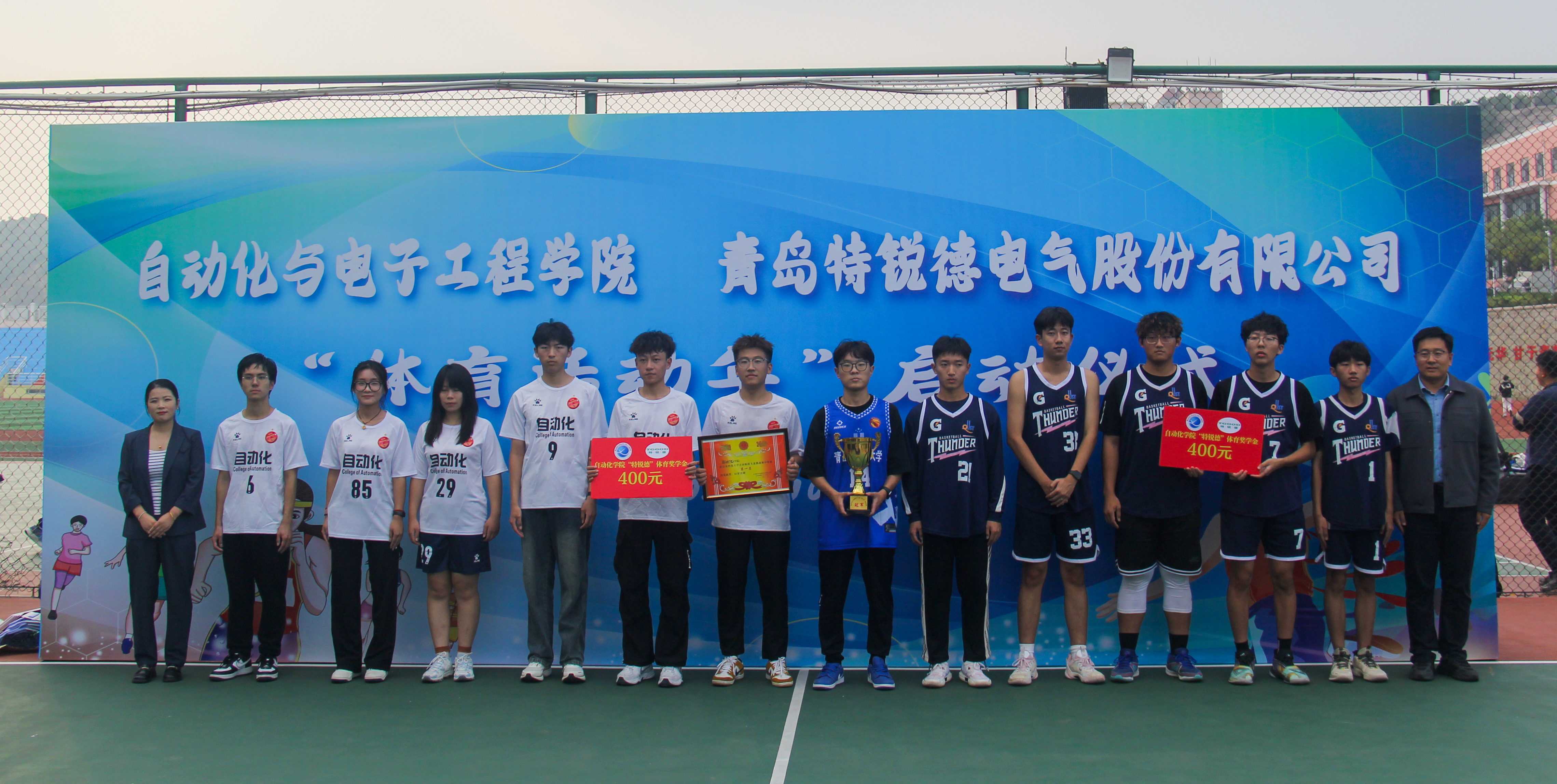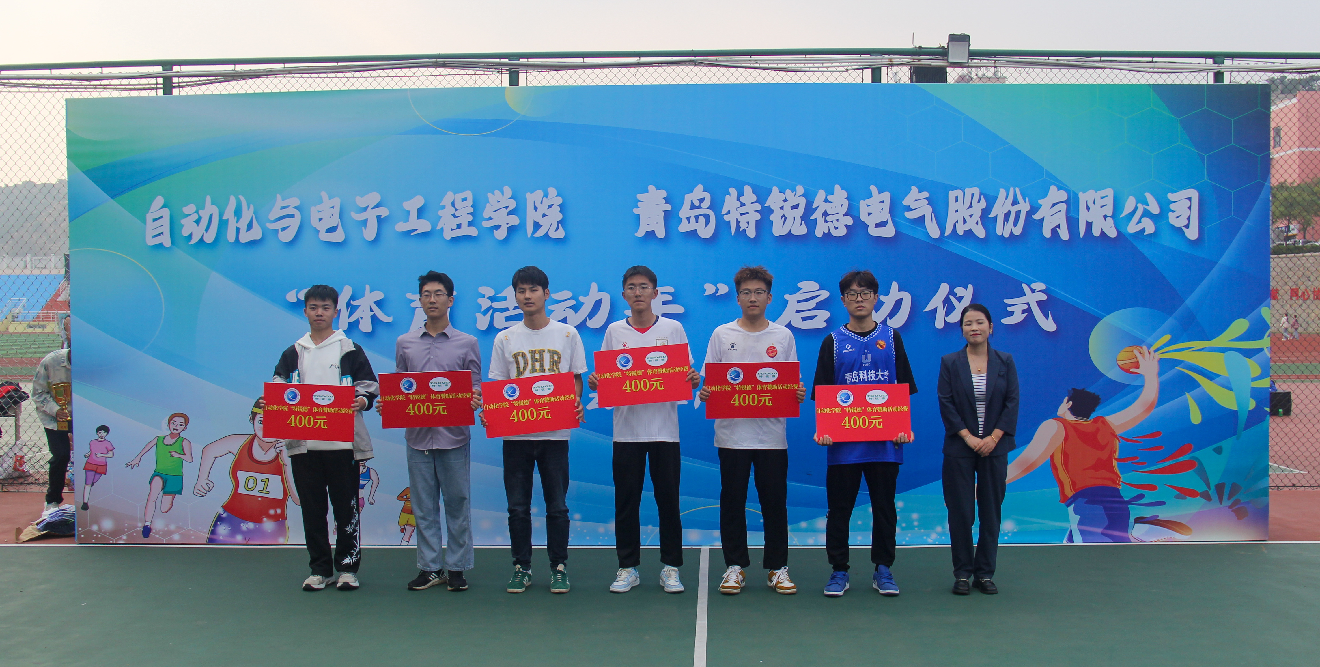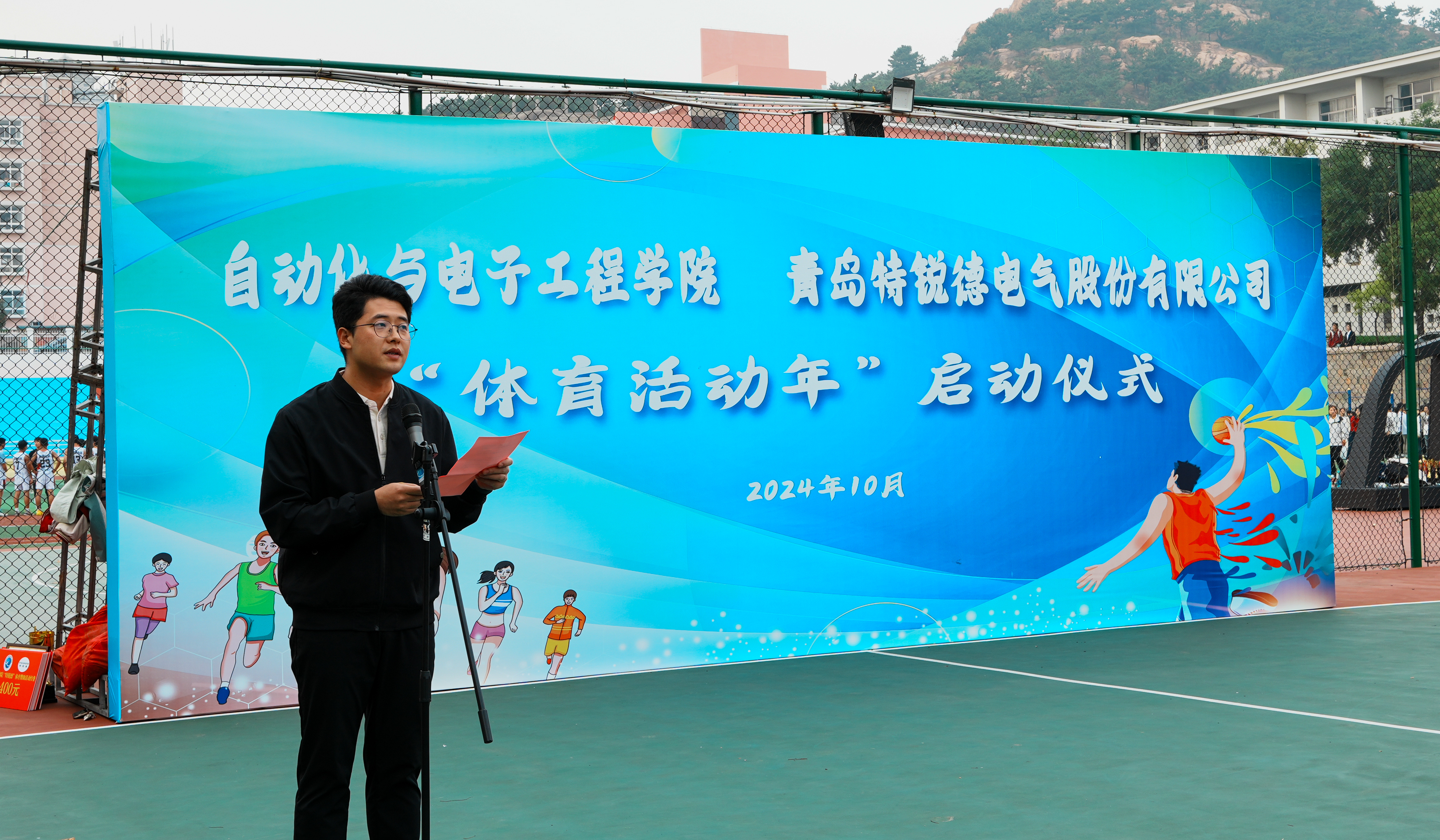 与青岛特锐德电气股份有限公司联合举办的“大学生体育活动年”启动仪式于南苑篮球场举行。青岛特锐德电气股份有限公司人力资源中心人力总经理助理张莹,学院党委书记李卉,学校教务处专职教学督导员楚晓东、学生处副处长李春家、团委副书记李浩,学院党委副书记兼副院长刘名森出席启动仪式。仪式由学院团委书记兼学工办主任雷静主持。