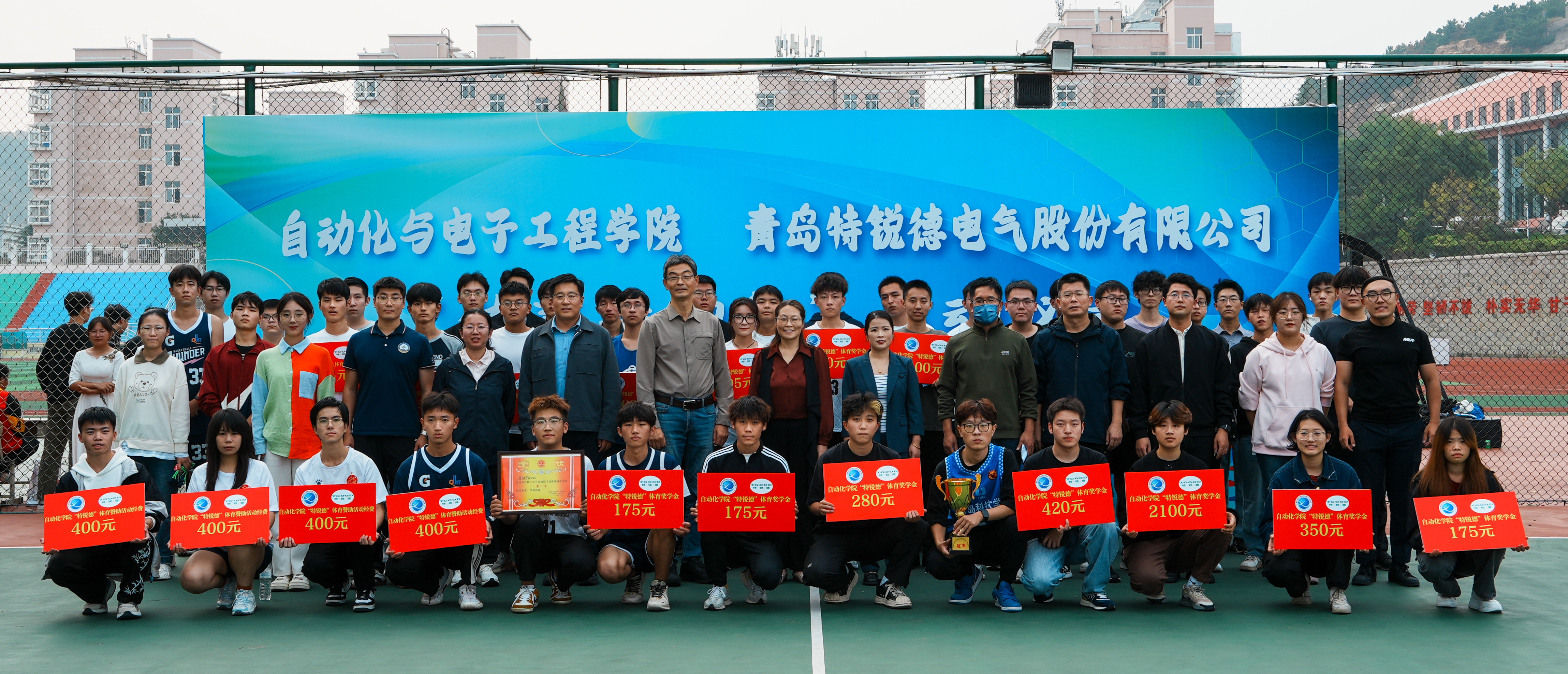 辅导员赵赪赪、刘志飞、李卓林、丁雅琼,2025届已签约特锐德公司毕业生,学生会成员,2022、2023、2024级班长、体育委员参加仪式。