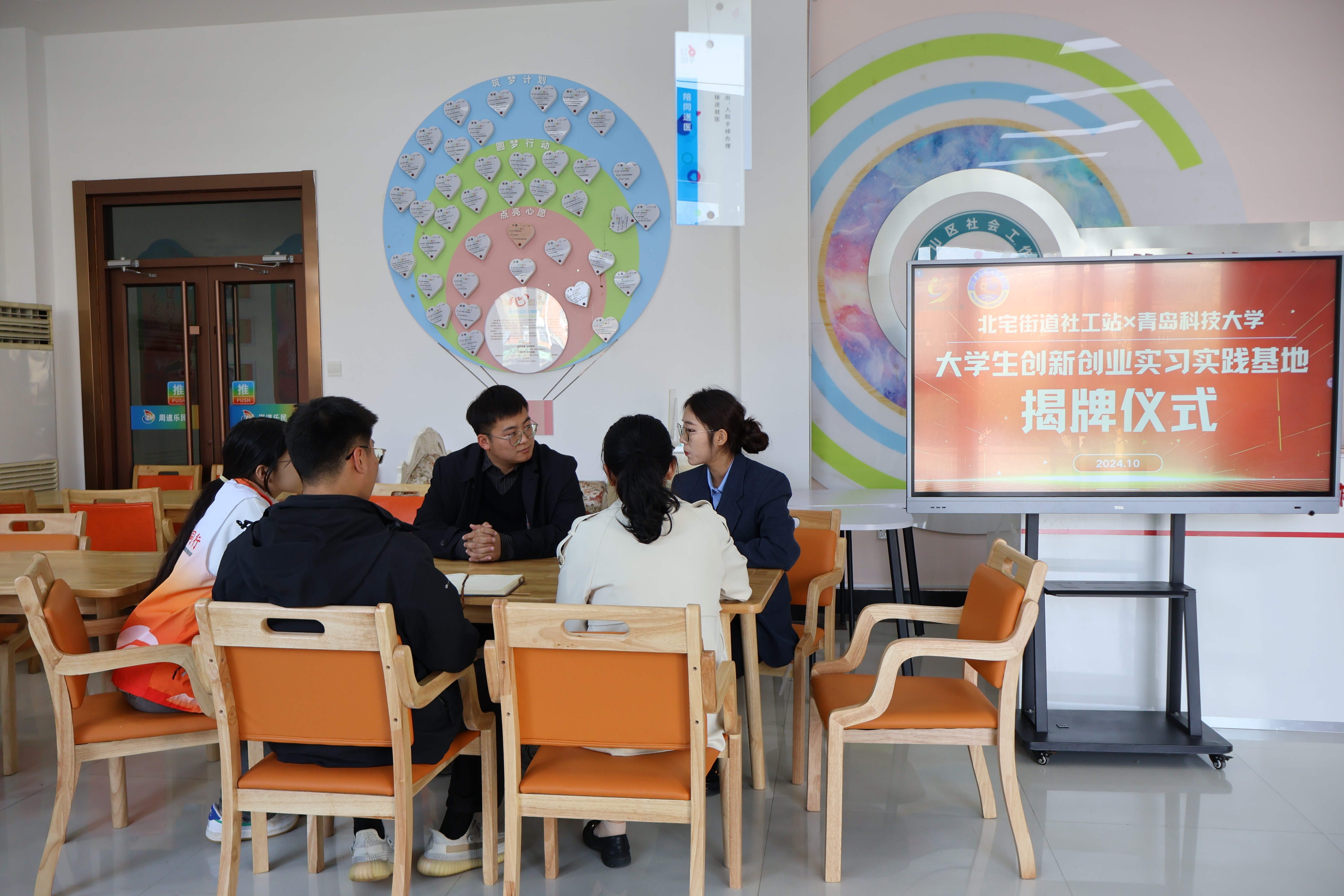 雷静与张荣基共同为基地揭牌,标志着北宅社会实践基地正式投入使用。张荣基汇报了北宅街道的基本概况及当前发展阶段所面临的瓶颈与挑战。双方围绕需求对接的关键节点,深入规划了未来大学生在志愿服务以及社会实践工作领域的具体内容与方向,并在共同打造“AI赋能乡村振兴”这一社会实践服务品牌上达成了广泛而深刻的共识。
