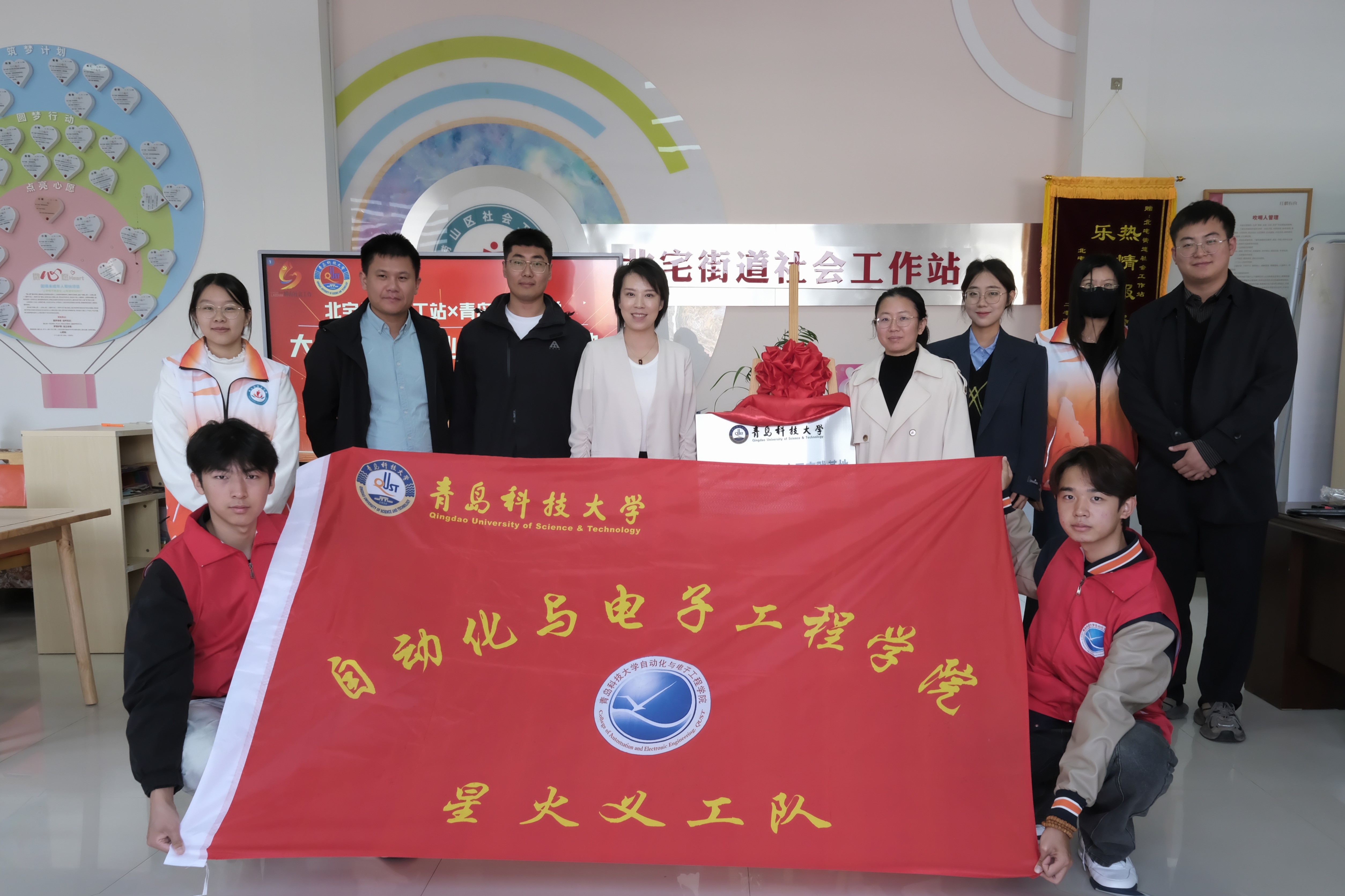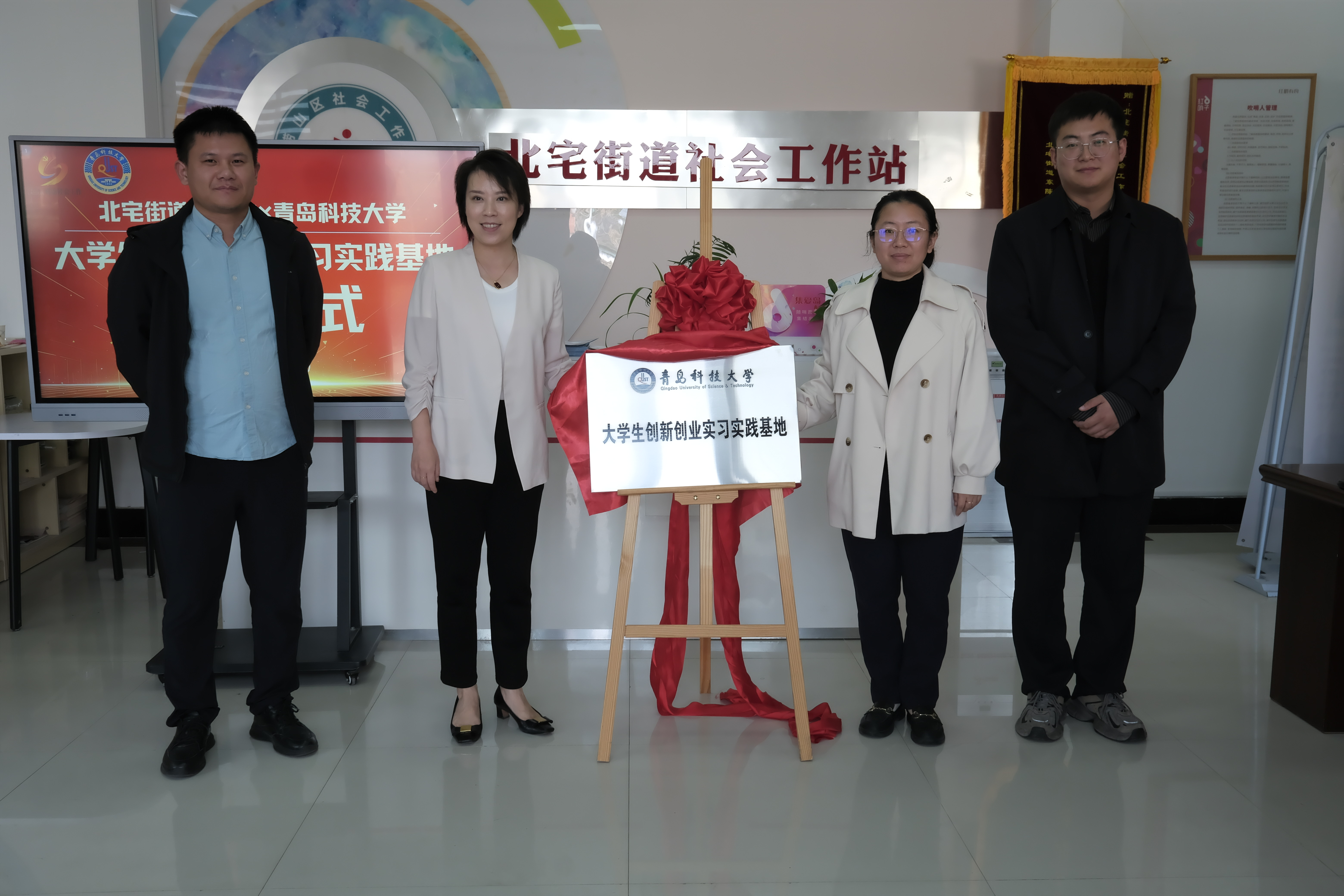 北宅社会实践基地揭牌仪式于青岛市崂山区北宅街道举行。学院团委书记兼学工办主任雷静,北宅街道办事处副主任鞠欣桐、民生保障中心民政负责人吕海超、社工站站长张荣基,学院辅导员代表、学生代表参加活动。