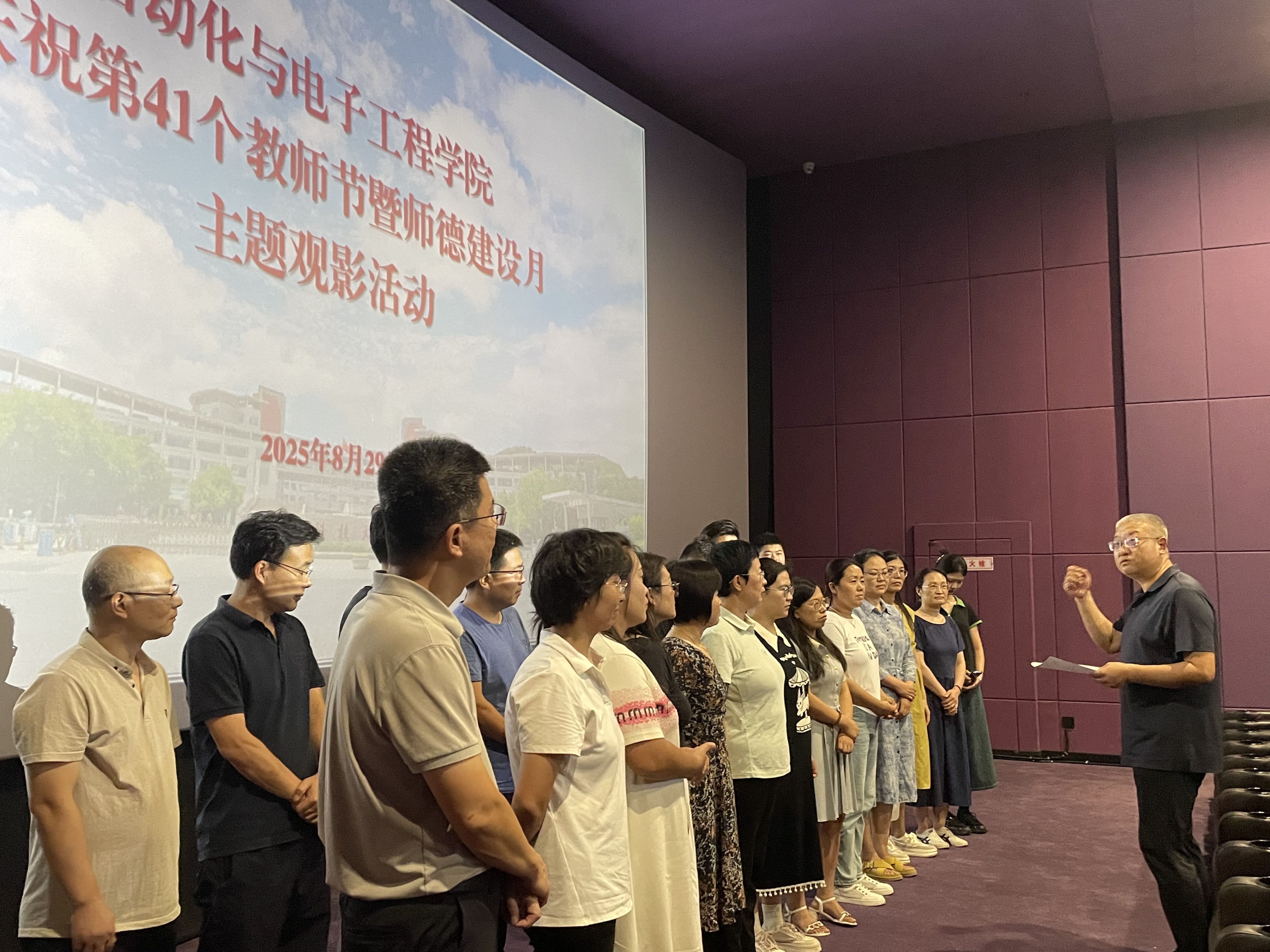 活动伊始,学院党委书记郭永作动员讲话。他指出,今年是中国人民抗日战争暨世界反法西斯战争胜利80周年,也是第41个教师节,在此时开展主题党日和师德建设月主题观影活动,既是对历史的深切回望,更是对使命的郑重践行。希望全体师生党员从历史中汲取精神养分,筑牢信仰之基,始终怀揣对国家和民族的赤诚热爱;赓续红色精神血脉,将观影感悟转化为推动教学科研、学习成长的实际行动,在岗位上履职尽责;更要铭记历史真相,以理性与担当守护和平,携手共创更美好的未来。