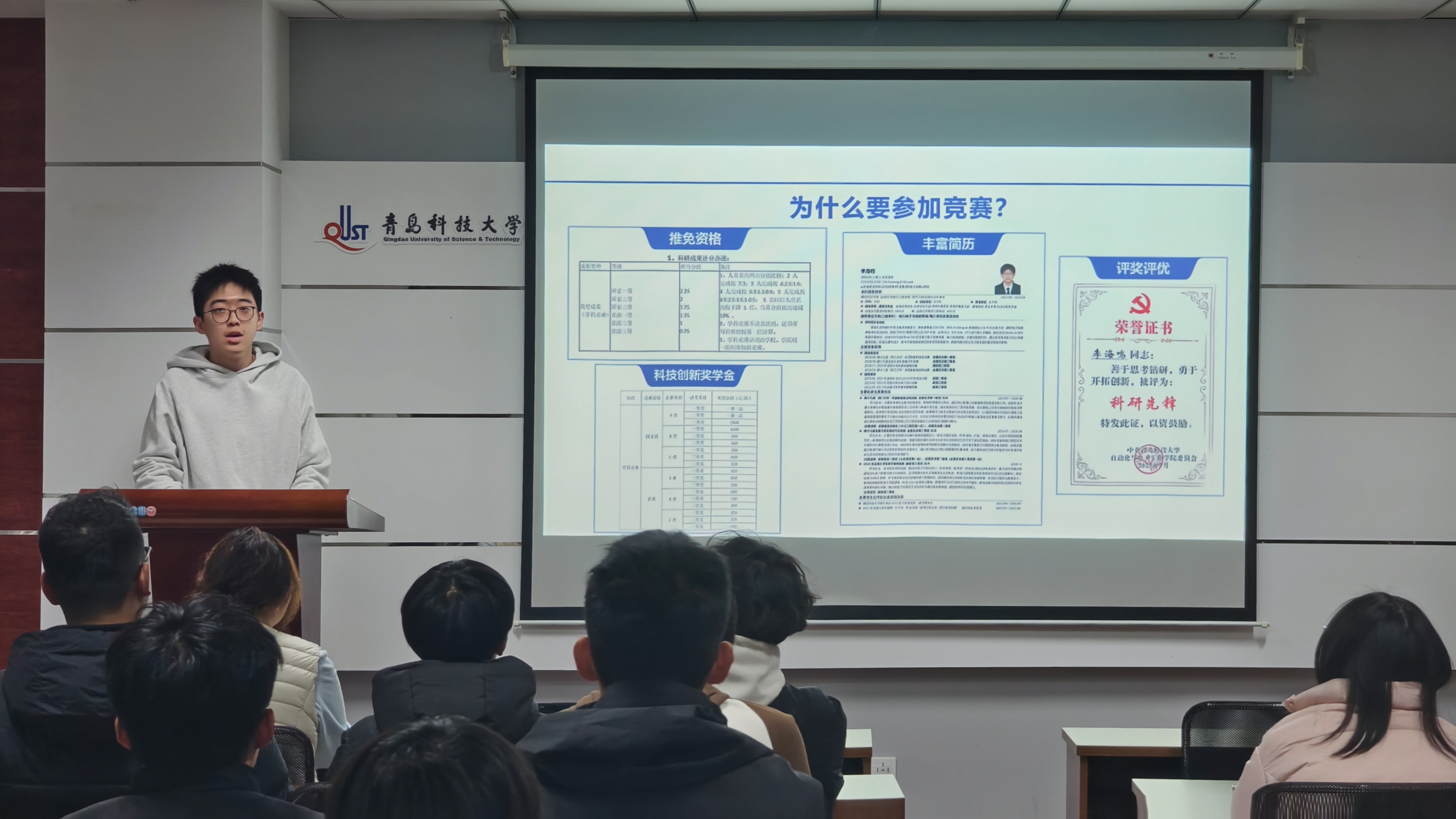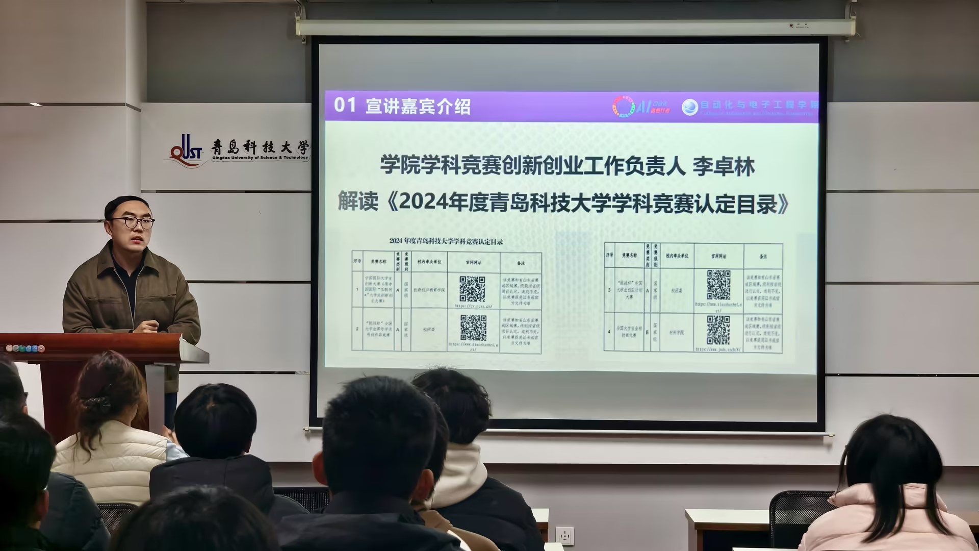 学科竞赛认定目录》,系统梳理赛事申报条件、时间节点及赛事主题,重点剖析自动化领域重点赛事的学科导向与能力要求。针对困难生群体“赛事认知模糊、参与信心不足”等痛点,李卓林以学院学子“以赛促学、以赛成才”的典型案例为支撑,鼓励同学们破除心理障碍,精准匹配自身专业优势选择参赛方向。
