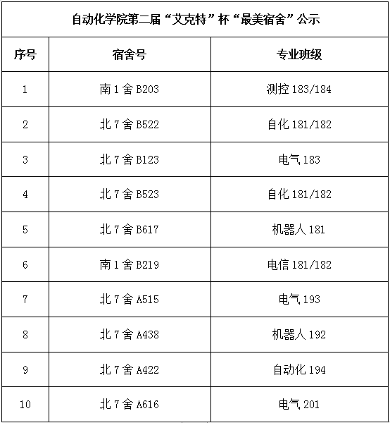 根据《关于开展第二届“艾克特”杯“最美宿舍”评选活动的通知》,经资格审核、年级评议、公开评审等环节,拟确定南1舍B203等10间宿舍为笔趣阁 第二届“艾克特”杯“最美宿舍”。现予以公示,公示期为12月10日至12月12日,如有异议者,请在公示期内实名向学院反映。