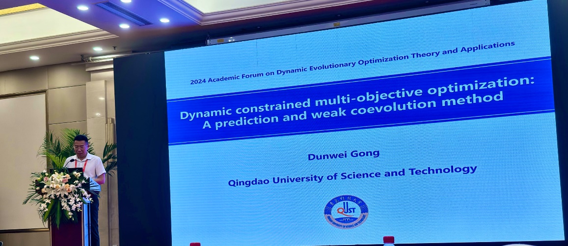 等国内外高校的多位知名专家学者作学术报告,围绕动态进化优化领域的最新学术成果和技术突破,深入探讨并交流了前沿理论、产业应用和发展趋势。巩敦卫教授应邀作了题为《Dynamic constrained multi-objective optimization: A prediction and weak coevolution method》的报告,针对已有研究处理动态约束优化问题的不足,汇报了基于预测和弱协同进化的约束多目标优化方法,为开发复杂约束条件下的智能优化算法提供了全新思路。