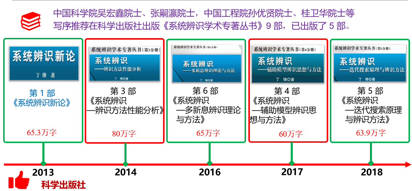 ●丁锋. 系统辨识――辅助模型辨识思想与方法. 科学出版社, 2017. 60万字。