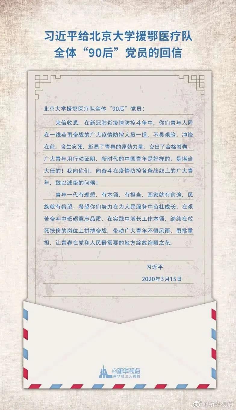 3月15日,习近平总书记给北京大学援鄂医疗队全体“90后”党员回信,向他们和奋斗在疫情防控各条战线上的广大青年致以诚挚的问候。