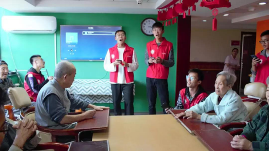 兴致之余,在义工队董天宇同学和张永健同学的领唱下,志愿者和老人们合唱《我和我的祖国》,歌声虽不像百灵鸟般美妙,但却如麻雀般淳朴。唱完后,大家不尽兴,又唱了《映山红》、《送别》、《团结就是力量》等老人们年轻时的歌曲。最后,“合唱环节”在《笔趣阁