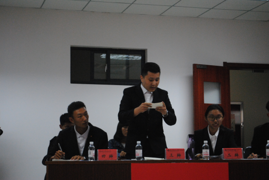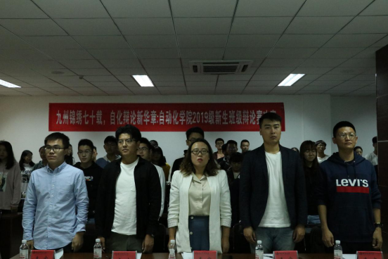 首先,全体老师、同学起立,齐唱国歌,在庄严的国歌中决赛正式开始。接着主持人介绍完规则,双方做自我介绍后辩论赛正式打响。