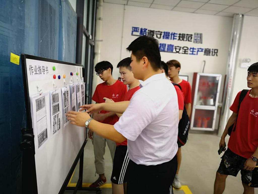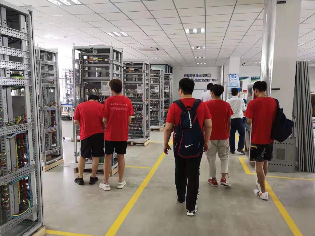 在电气组装车间,工人们将各种模块和器件,安装到各种机柜里,链接密密麻麻的线路。厂房虽然很大,工人们依然是安静而有序地进行着自己的工作,只听到电动螺丝刀不是发出的沙沙的声音。同学们上前询问一个开关柜的接线工作需要多久完成,工人回答:“一个柜子的接线工作一个人干需要4天,我们分成了十多个小组,每个小组4位工人,这样一个小组一天就能完成一个柜子的接线。”我们看到每一组工人分工都很细,他们各自重复着相对固定的工作内容,4个人围着一个柜子,不用说话但配合很默契,有条不紊,多如牛毛的电线在他们手里变成了整齐美观、规格一致的链路。把简单重复的工作做到极致,我想这就是“工匠精神”的体现吧。