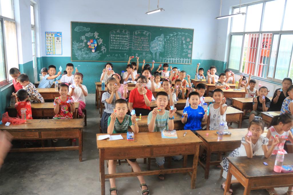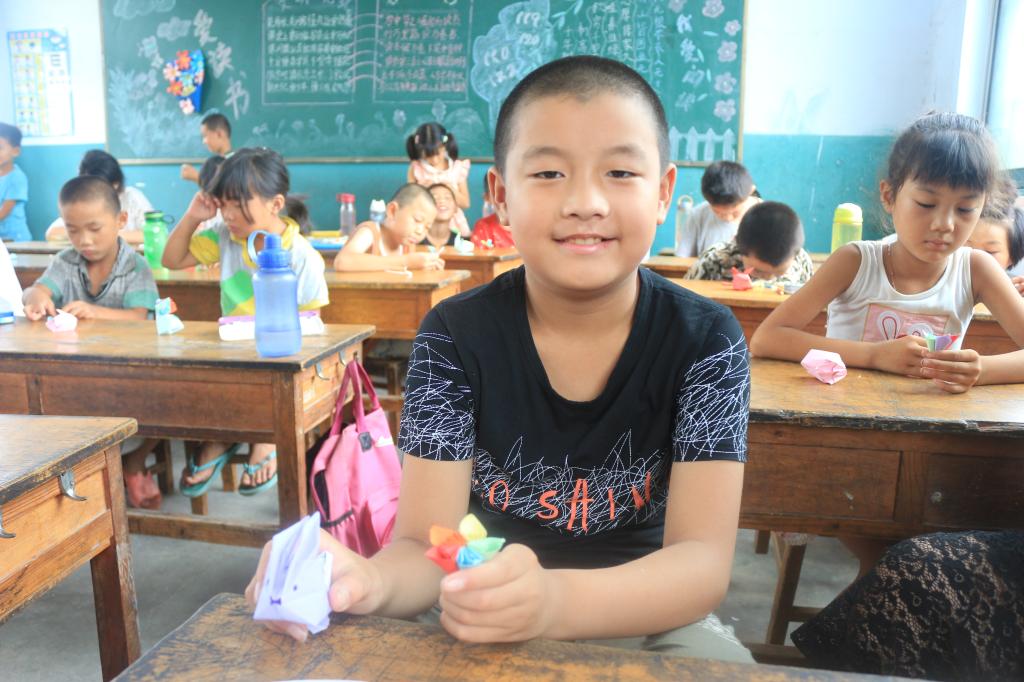 课程开始之前,调研团成员向孩子们展示事先叠好的一系列折纸作品,通过举手投票表决的方式确定本节课重点教授的内容,最终结果为折小兔子和樱花。调研团成员向孩子们发放彩纸,孩子们利用手中的彩纸,折出自己脑海中的兔子和樱花。有一定的实践基础后,调研团成员在讲台上讲解折纸的步骤,孩子们根据讲解一步一步折出,拿着自己的成果开心的向大家展示。