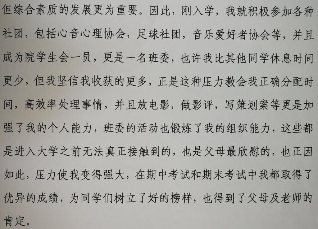 生活上,第一次离开父母,从对独立生活、文化背景差异的同学以及集体生活的不适应到逐步适应的大学生活、提高的自理能力、自律意识、从点点滴滴中感受到的亲情、同学情、朋友情、师生情。慢慢学会珍惜与感恩,应积累经验、丰富阅历、调整心态、锻炼身体,才能拥有一颗强大的内心世界。