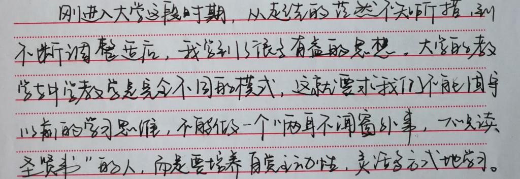 思想上,大学是开放式管理,懈怠往往是学生进入大学后的普遍现象,经过了一个学期的学习,同学们也更深刻地认识到自己思想上的问题,进入大学后没有中学那样严格的时间管理,应学会自己安排时间,将有效的时间利用起来,既要保证学到知识,又要让自己能够有更多的机会参与各类活动,丰富大学生活。