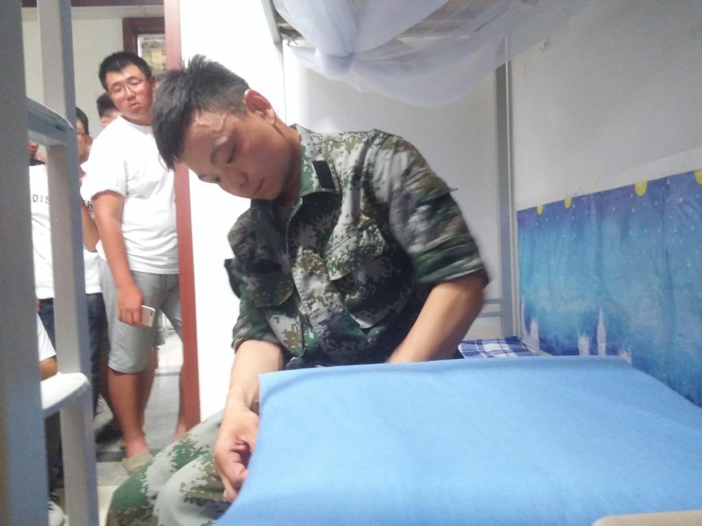 纪检部和外联部的负责人首先走访了每个宿舍,以军训时期的内务要求针对性地对每个宿舍的物品摆放提出了建议。在通知的过程中发现,新生宿舍的卫生水平普遍很高,但是由于一些人家离得较远,携带的行李较多,尽管摆放整齐但仍显得略为杂乱。此外,由于本身的需要,女生宿舍桌面物件较多,应收到抽屉内,保持桌面的整体大方。至于一些基本的,如脸盆放在阳台上、鞋子应该摆在床底、枕头和被子摆放于床的两头等,同学们都做的不错。随后,在每个楼层的一号宿舍,军协的教官为没有掌握叠经典“豆腐块”的新生示范了方法。尤其是细节部分,四个角一定要捋直,被子面一定要压平,才能显得方正。军被代表着自律和标准,这也是卫生检查的项目之一。
