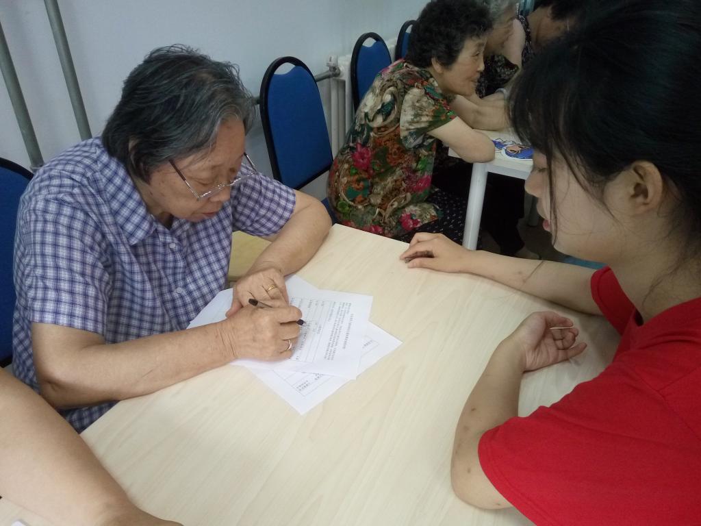 在问卷调查开始之前,实践团成员在主任纪云波的组织协调下做了老年保健操,来帮助老人们放松情绪,同时增强彼此间的了解,逐渐打开活动局面。志愿者们以口述的形式帮助老人们进行问卷填写,并由问卷问题延伸至老人的情感诉说,老人们也十分愿意跟志愿青年们进行交流。经过初步的调查,老人们在物质生活方面比较满足,以退休金为主要经济来源,他们大多欠缺的是精神情感上的心理需求。他们表示每天最快乐的时光就是在老年人日间照料中心跟老师学习按摩、保健等课程以及与其他老人一起唱歌跳舞做针线活等活动。