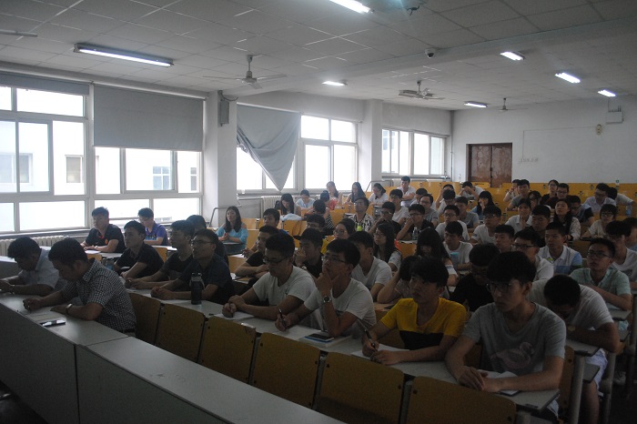 2012级学生党支部书记王帅、2013级学生党支部书记刘海波、2015级研究生党支部书记孙晓旭以及学院近百名学生党员听取本次党课。