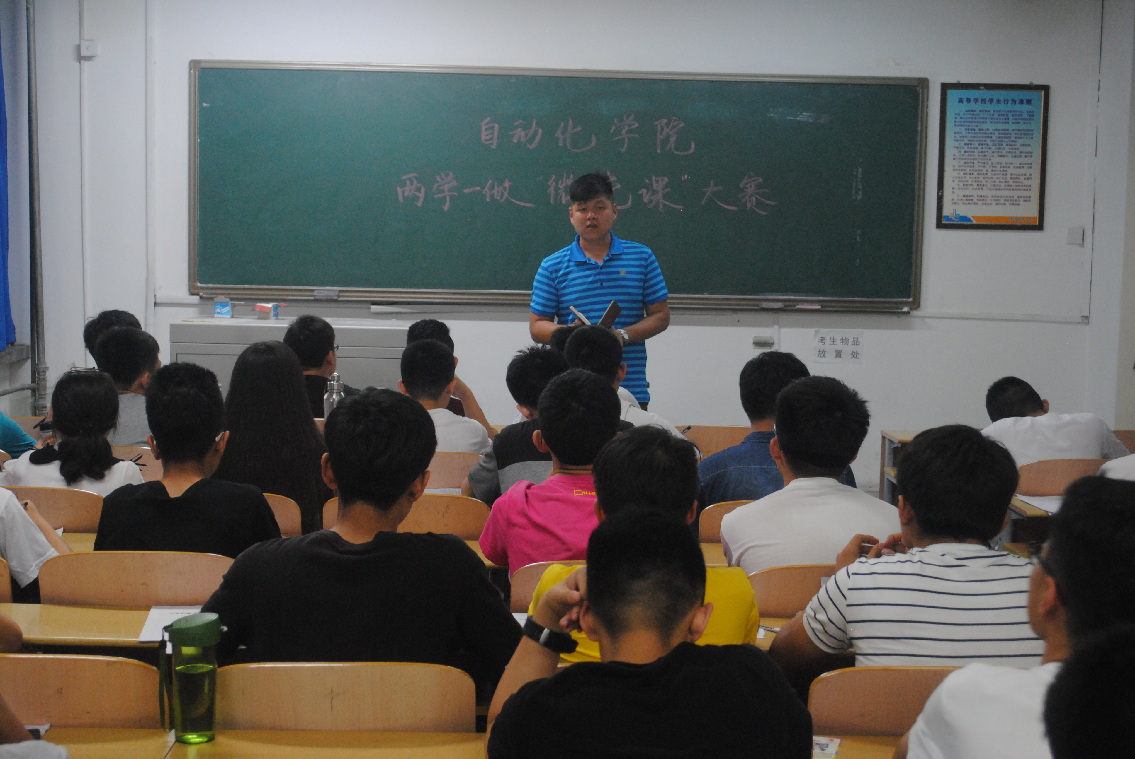 比赛之前,孙晓旭老师发表讲话,他简要说明了本次大赛的目的,他指出,两学一做,“重点在学,关键在做”,每一位学生党员,要时刻牢记自己的党员身份,坚定理想信念,做一名合格的共产党员。接下来,选手们在短短6分钟的时间内,言简意赅、富有寓意,通过采取小角切入、多角论证、举实例用数据等形式和方法,展开了本次大赛。任振宇同志从具体事例出发,向大家讲述了基层党员的日常工作,予人思考;李超群同志则以学院工作为出发点,指出了一名合格的学生干部应该具备的多种素质。39名同志从不同侧面,不同角度,结合党章党规、习近平系列讲话,围绕坚定共产主义理想信念、牢固树立党的意识和党员意识、强化宗旨意识、践行社会主义核心价值观,以身边小事和自身学习工作经历为切口,深入学习和挖掘身边优秀党员的先进事迹,引导广大党员同志做“四讲四有”的合格党员。