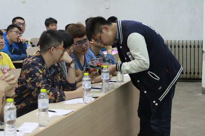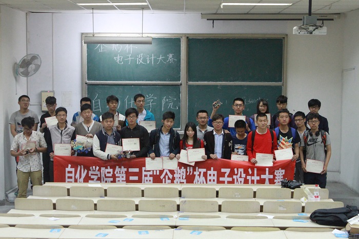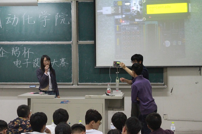本次比赛主要面向2015级全体同学,同时鼓励同学们邀请2014级学长、学姐进行传帮带组队,意在挖掘和选拔自动化科技创新达人,为学校“校长杯”工业自动化挑战赛,及其各分赛事电子设计竞赛、麦科杯工业自动化挑战赛、智能汽车竞赛和“挑战杯”大学生科技作品竞赛等各赛事选拔储备人才。参赛队员经过前期的培训和指导,从采购单片机处理器,购买电阻、电容开始,一步步搭建、焊接和调试,最终开发出专属自己团队的科技创新作品。比赛现场,各队都完成了实物作品的制作,并进行了现场展示。尤其“智能浇花装置”、“蓝牙自动控制小车”“3D光电跟踪头”和“温湿度测试仪”等作品,设计者善于观察生活,产品源于生活、服务于生活;经过评委打分和现场观众的大众分数,最终5号团队的作品“点滴计时器”获得了此次比赛的一等奖,评委为获奖者颁发证书和奖品。