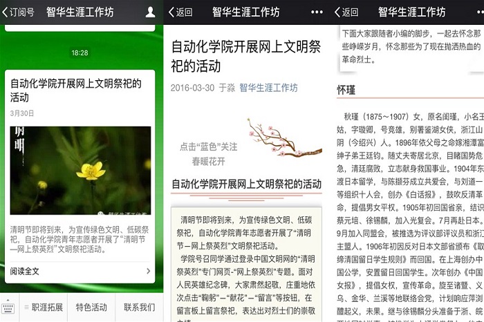 一方面,学院组织在校学生党员和入党积极分子代表分赴青岛市革命烈士纪念馆、青岛市烈士陵园参观祭扫,学生党员在烈士纪念碑前宣读祭文、献花默哀,重温入党誓词,坚定党员信念;利用公众微信平台发布《清明网络绿色祭祀倡议书》,开展“网络祭祀”活动,进入手机活动页面,秋瑾、李大钊、董存瑞、黄继光等英烈的事迹让人肃然起敬,同学们纷纷为这些英烈献花留言,表达对先贤英烈的感恩与敬仰。