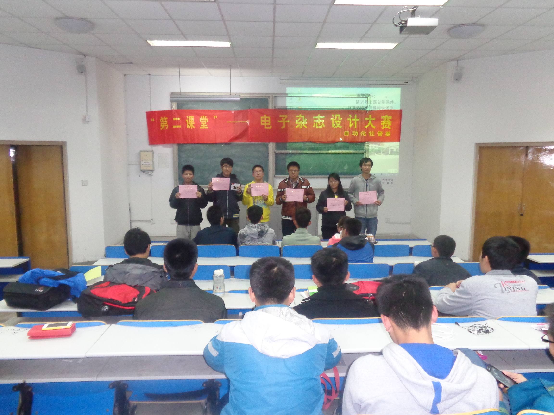 下午四点,比赛正式开始。本次电子杂志制作大赛的主题是“大学生人生职业规划。”参赛选手都围绕着这个主题发表了自己的见解和看法,从不同角度和不同阶段展示了他们眼中的大学生人生职业规划应该是如何定义的。选手们先后上台讲解着自己精心准备的作品,台下观众认真地听着他们的解说。在参赛选手们全部展示完他们的参赛作品之后,电子爱好者协会会长周文奇对每个参赛作品都做了简短的点评。最后,评委们按电子杂志的模板应用、色彩搭配角度以及选手的情感演讲等方面进行打分,评选出一二三等奖。姜玉峰荣获一等奖,尹君扬、刘术生获得二等奖,张庭玉、许晓、胡麟来获得三等奖。