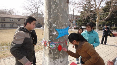 内树木繁多,已成为学校内一道亮丽的风景。3月12号中午下课后,青年志愿者协会的志愿者们在图书馆前集合,虽然大部分人还没吃饭但仍旧兴致昂扬。他们把提前准备好的宣传标语拿出来,走遍了学校的各个角落,把宣传标语张贴在树上,以提醒同学们注意保护树木。“地球是我家,绿化靠大家”、“小草青青,脚下留情”、“一花一草皆生命,一枝一叶总有情”,一句句温馨的标语无不在警醒着同学们,爱护我们共同的家,爱她的一草一木。