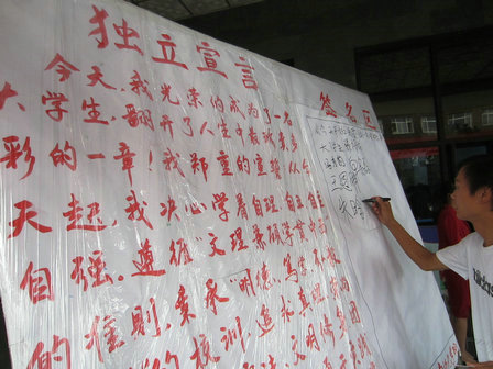的迎新点入口处,有一块醒目的红板,上面印着新生的独立宣言书:“今天,我光荣的成为了一名大学生,翻开了人生最珍贵多彩的一章!我郑重的宣誓:从今天起,我决心学着自理,自立,自主,自强,遵循“文理兼顾,学贯中西”的准则,秉承‘明德,笃学,弘毅,拓新’的校训,追求真理,崇尚科学,遵纪守法,文明修身,团结友爱,勤奋学习,勇于实践,立志成长,誓言做社会主义事业的建设者和接班人。为中华民族的伟大复兴贡献自己的力量!”每一个到来的新生都首先要在独立宣言书上签名,宣誓着:从第一天起,我选择成长!每一笔认真的签名,都透露着他们坚定的决心和满满的信心,透露着他们对未来的展望和期待。