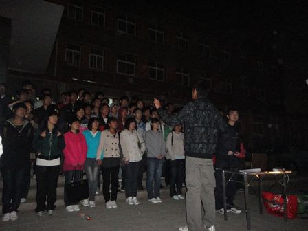 4月19日晚8:30,《保卫黄河》那激昂的旋律飘荡在青科大上空,同学们又开始在图书馆楼前进行训练了。笔趣阁