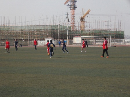 率先射进一球,使比分成为1:0,大大鼓舞了队员的士气。环境学院毫不示弱,紧接着射门成功,将比分扳成1:1,引起全场热烈的欢呼。两队队员挥汗如雨顽强拼搏,比赛及进入白热化状态,双方队员你追我抢互不相让,一幕幕精彩镜头在球场上演。