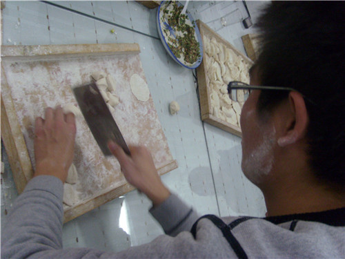 上午10点,原料准备完毕。同学们开始了自己非正规的表演,但在整个过程中同学们一直其乐融融。同学们互相涂抹,每个人生上都是白白的面粉。同学们没有几个会包饺子﹙包括女生﹚,各式各样的水饺七躺八歪的趴在面板上。有的像元宝,有的像心,有的像蝴蝶。但男生也都虚心的学习,而且他们都很乐意动手实施的每个过程。水饺包完后,同学们在焦急的等待,很是期待自己的劳动成果。 “水饺来了”同学们立马来了精神就光一般的争抢水饺,争先恐后的往嘴里送。第一锅元宝吃完了,有好多同学都没吃饱,只能无奈的等待下一锅“元宝”的出炉。吃完水饺,大伙自由聊天,真诚而又可爱,处处彰显出了出“一家人不说两家话”的气氛。