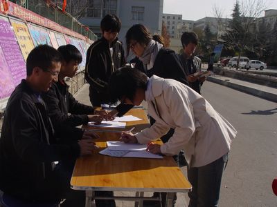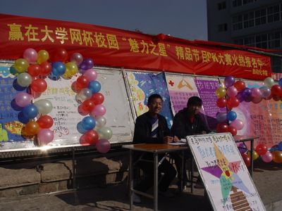 学生会主席张锐、副秘书长刘晓康在现场分配任务,学生会各部干事负责具体的报名及宣传单页的发放工作。