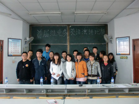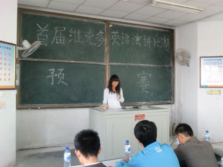 10级的同学参加。首先主持人宣布“首届维克多英语演讲比赛”正式开始,依次介绍了比赛评委和比赛规则。接下来二十五位同学依次登台进行自由演讲。选手们纷纷拿出自己看家的本领,他们或介绍发生在身边的趣事,或者讲自己的兴趣爱好,或介绍自己的家乡,或者描述来到大学后的感受。有的选手稳重大方、有的选手诙谐幽默,显示出自己优秀的口才和口语表达能力,现场气氛在掌声中一次次达到高潮。经过激烈角逐,最终十一位选手进入了最后的决赛,大家为进入决赛的选手响起了热烈的掌声。接着校英语爱好者协会梁轲同学做了总结讲话,对进入决赛的同学表示祝贺,对所有参加此次比赛的同学提出了自己的希望,希望他们能认识到自己的不足,向优秀的同学学习,不断提高自己的英语水平。