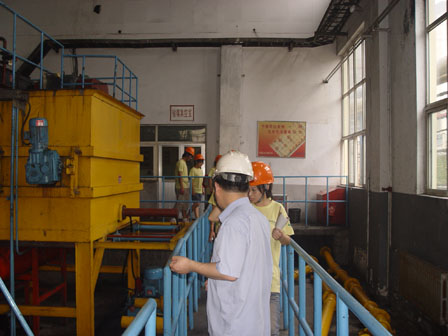 在参观实践的过程中,郭经理详细的介绍了发电的唯一燃料——煤泥。原煤从主井提升上来,进入洗煤厂,选出来成块状的,叫做精煤,也有的叫做块煤;还有其中成颗粒状的煤渣、小煤块,就叫做中煤;那最后沉到水底的煤灰、煤屑就被称为煤泥。它含有的主要是细分煤、少量的水和稳定量的纤维素醚化合物,好煤洗剩下的也都是优质煤泥。良达煤矿秉承科学发展观中可持续发展的指导思想,将煤矿生产中产生的废弃物煤泥进行加工将其制成一种悬浊液的形态,这样即能是煤更加充分的燃烧,增加热值,又便于向锅炉中增加燃料,一石二鸟。从矿上运来的煤泥,首先存放在煤泥仓库,然后用铲车将其放到传送带上,运入加工车间,在搅拌机的搅拌下加工成悬浊液,用泵直接泵入锅炉顶部,这是整个煤泥在电厂中的传输和利用过程。