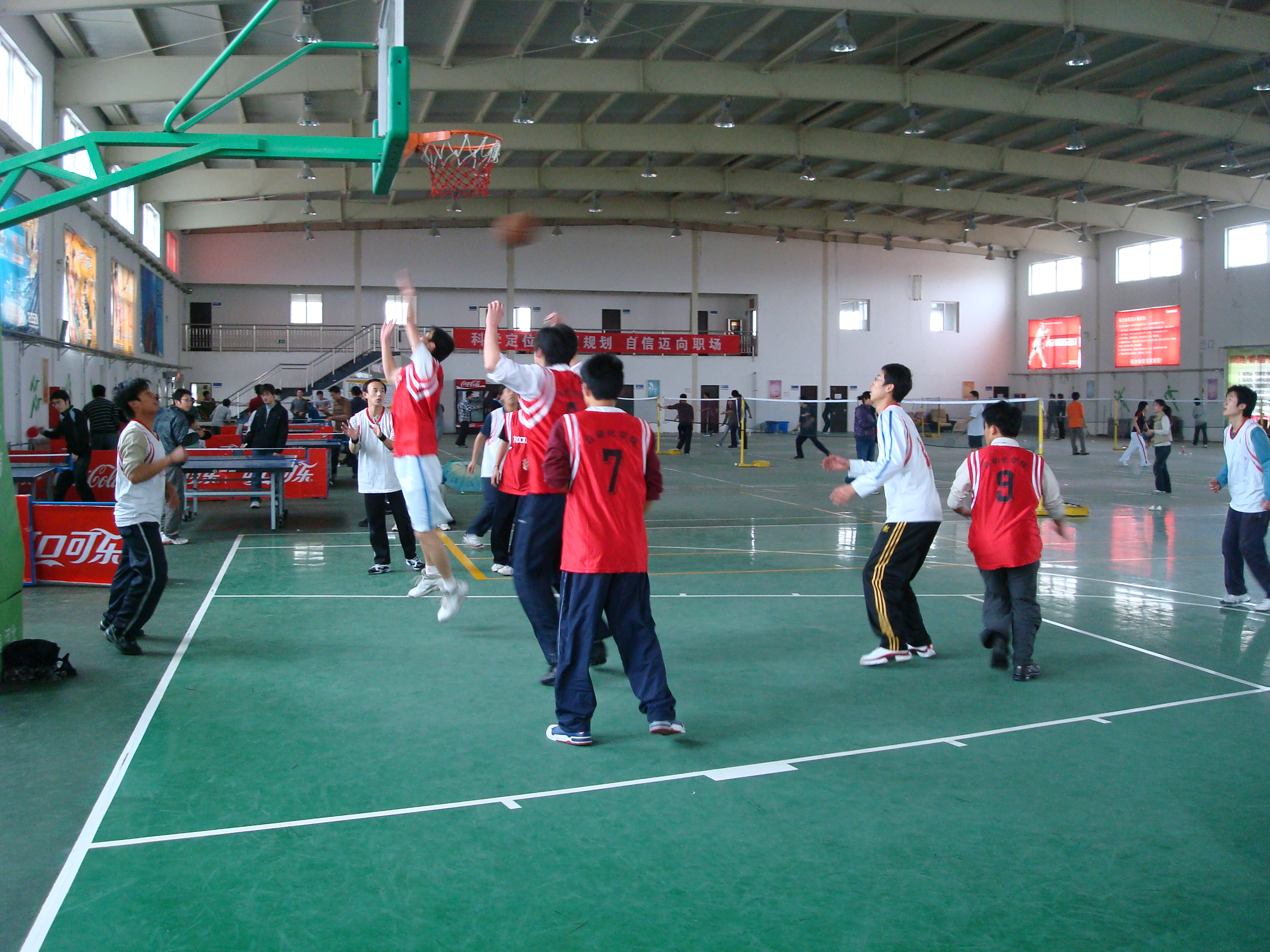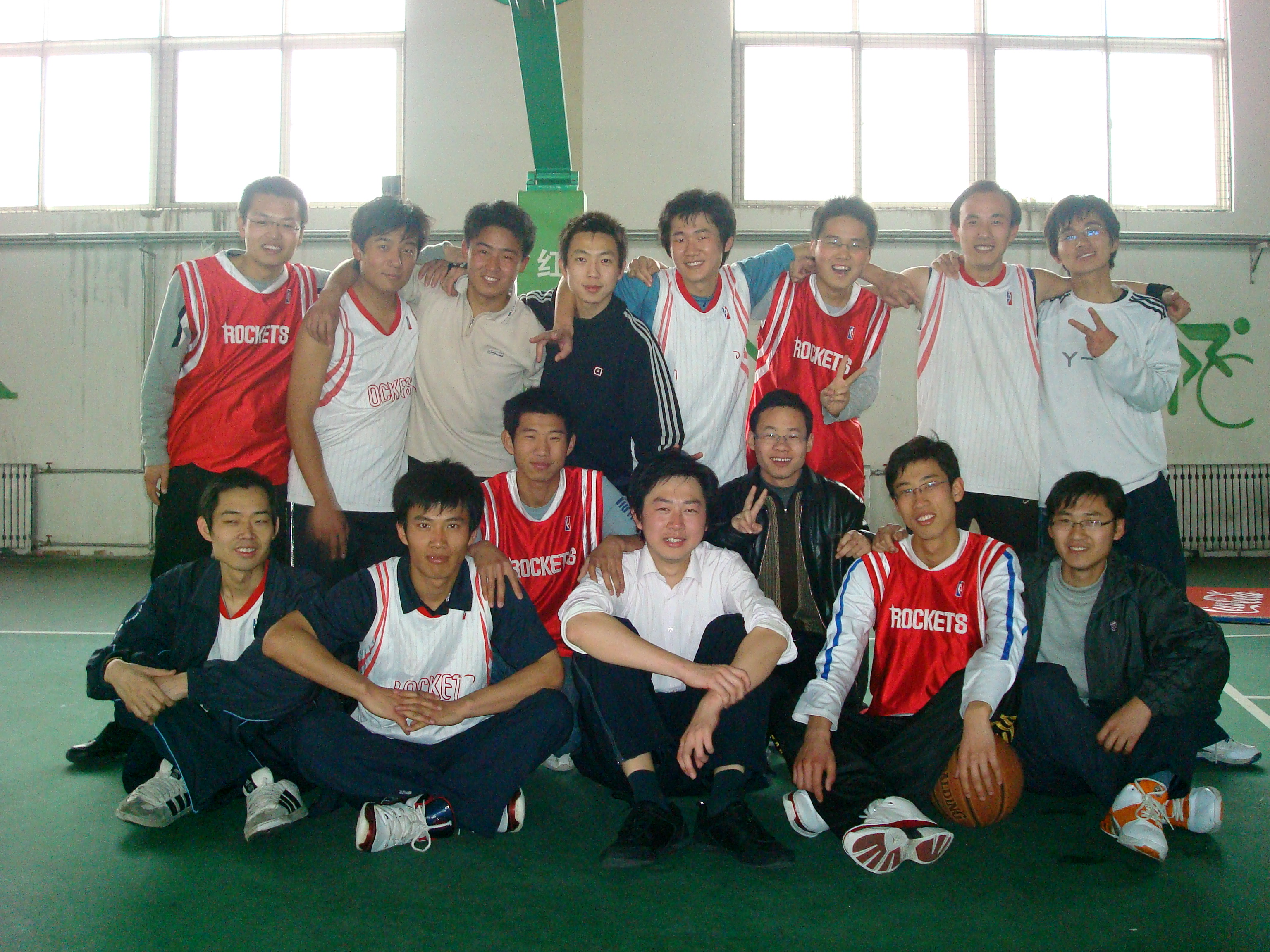 下午2点,07,08级的的同学们就来到体育馆热身准备,这是一群热爱篮球的同学,虽然他们有的已年近30,有的刚刚从外地出差归来,但这些丝毫并没有减少他们对篮球的热情。几乎每周三他们都早早起来打球。现在是实战的时刻,现在是为荣誉而奋斗的时刻。每一名同学都全身心投入比赛中,每一个人都在展现着他们的团结和毅力。经过上下半场苦战,最终双方比分为66:60,07级研究生获胜。在比赛中,双方比分咬得很紧,场面异常激烈,特别是07级的付东纪同学,摔伤了几次但仍然坚持比赛,也许是被他的顽强精神所感动,07级同学在没有替补的情况下最终取得比赛胜利。