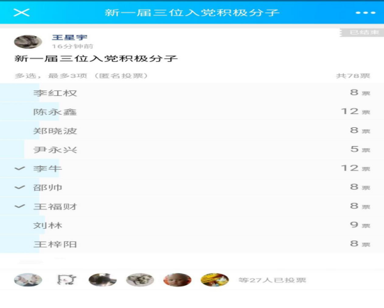 本次推优大会候选人有李红权、陈永鑫、郑晓波、王福财、邵帅、尹永兴、李牛、刘林、王梓阳共九人。这九位同学依次上台进行自我评价,态度端正。其中候选人李牛说:“我深受父母影响,入党意志坚定,学习上刻苦认真,被选为班委,工作上比较热情,希望可以入选。”