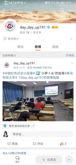 活动结束后,中法191团支部将自己的活动分享到自己的支部微博,在记录团支部成长的同时,倡导更多的人了解英雄事迹、学习英雄精神!