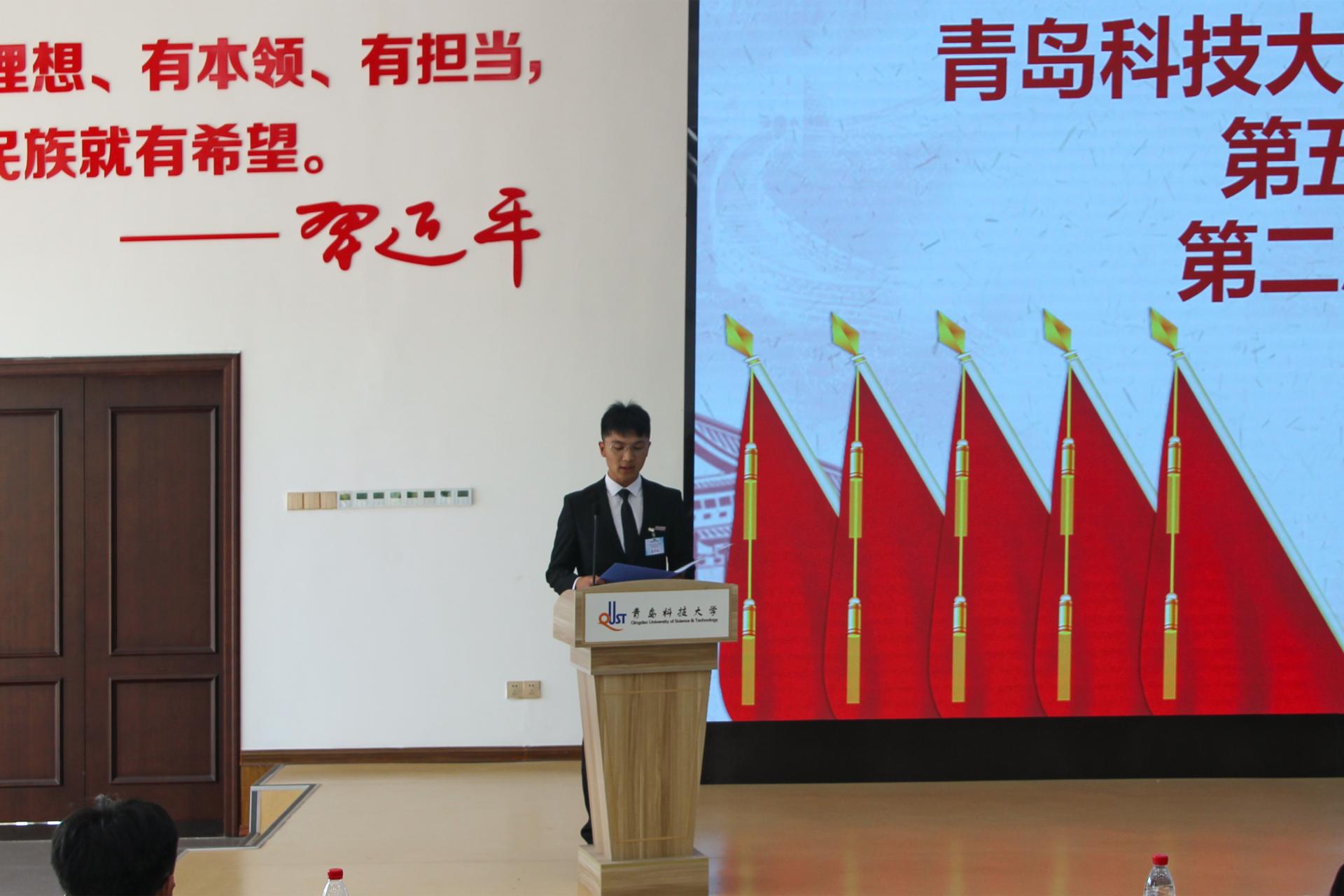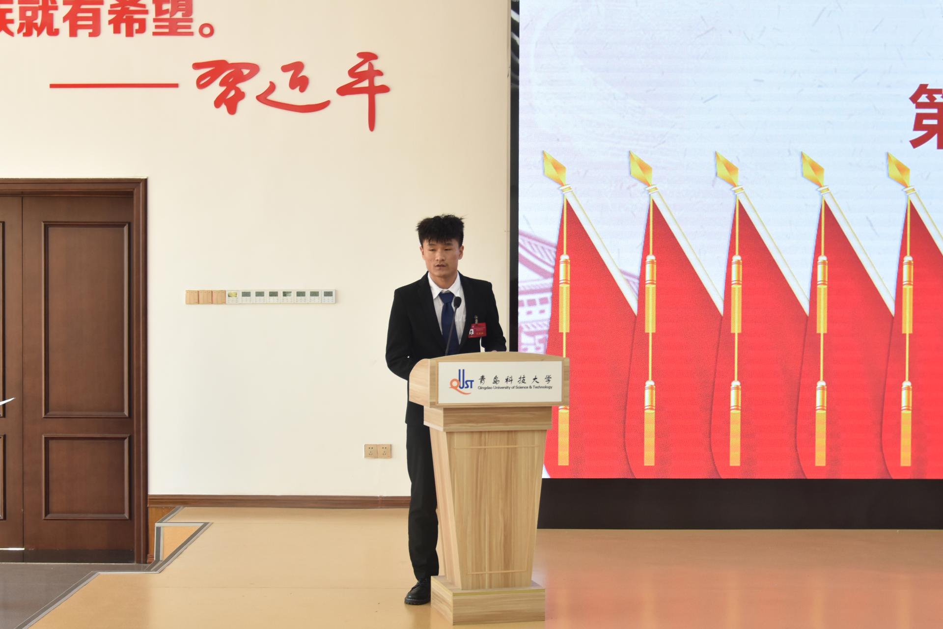 机电工程学院学生代表张致远发言,希望青科大学子能抓住时代的接力棒,勇立潮头敢于奋斗,向前迈进,奔赴更加美好的明天!