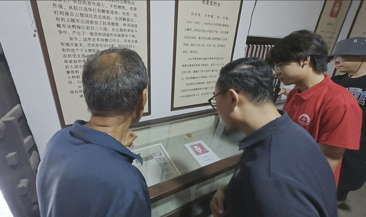 “当年鬼子在别的村扫荡两遍,在我们村扫荡多一遍。”刘书记看着柜中陈列的烈士照片,向我们讲述着抗战时期的那些历史事件。“这位是刘学山烈士,当过副军长,参加过抗美援朝、抗日战争、解放战争,立下过很多战功!”随着刘书记的指引,队员们抬头看着墙上的英雄烈士,看到他们立下的汗马功劳,心中的敬意更加深厚。