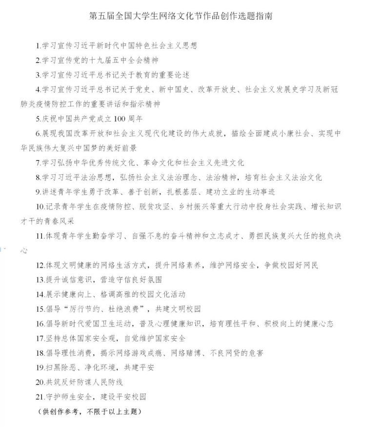 为深入学习贯彻习近平新时代中国特色社会主义思想,全面贯彻党的十九大和十九届二中、三中、四中、五中全会精神,切实将习近平总书记关于党史、新中国史、改革开放史、社会主义发展史学习及新冠肺炎疫情防控工作的重要讲话和指示精神贯彻落实引向深入,围绕迎接建党一百年行动,加大优秀网络文化供给力度。根据教育部思想政治工作司、中央网信办网络社会工作局关于举办第五届全国大学生网络文化节通知的要求,学院开展大学生网络文化节作品征集活动。现将有关事宜通知如下: